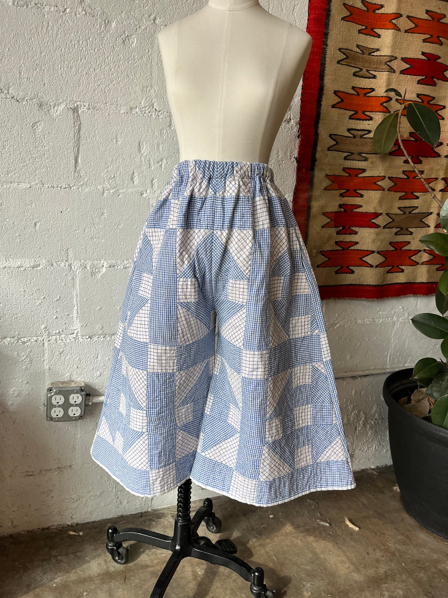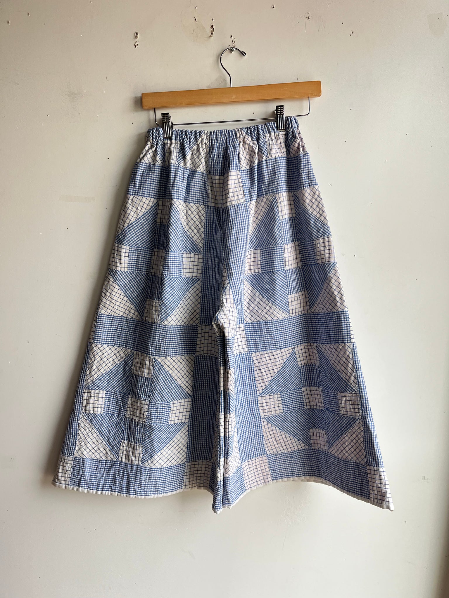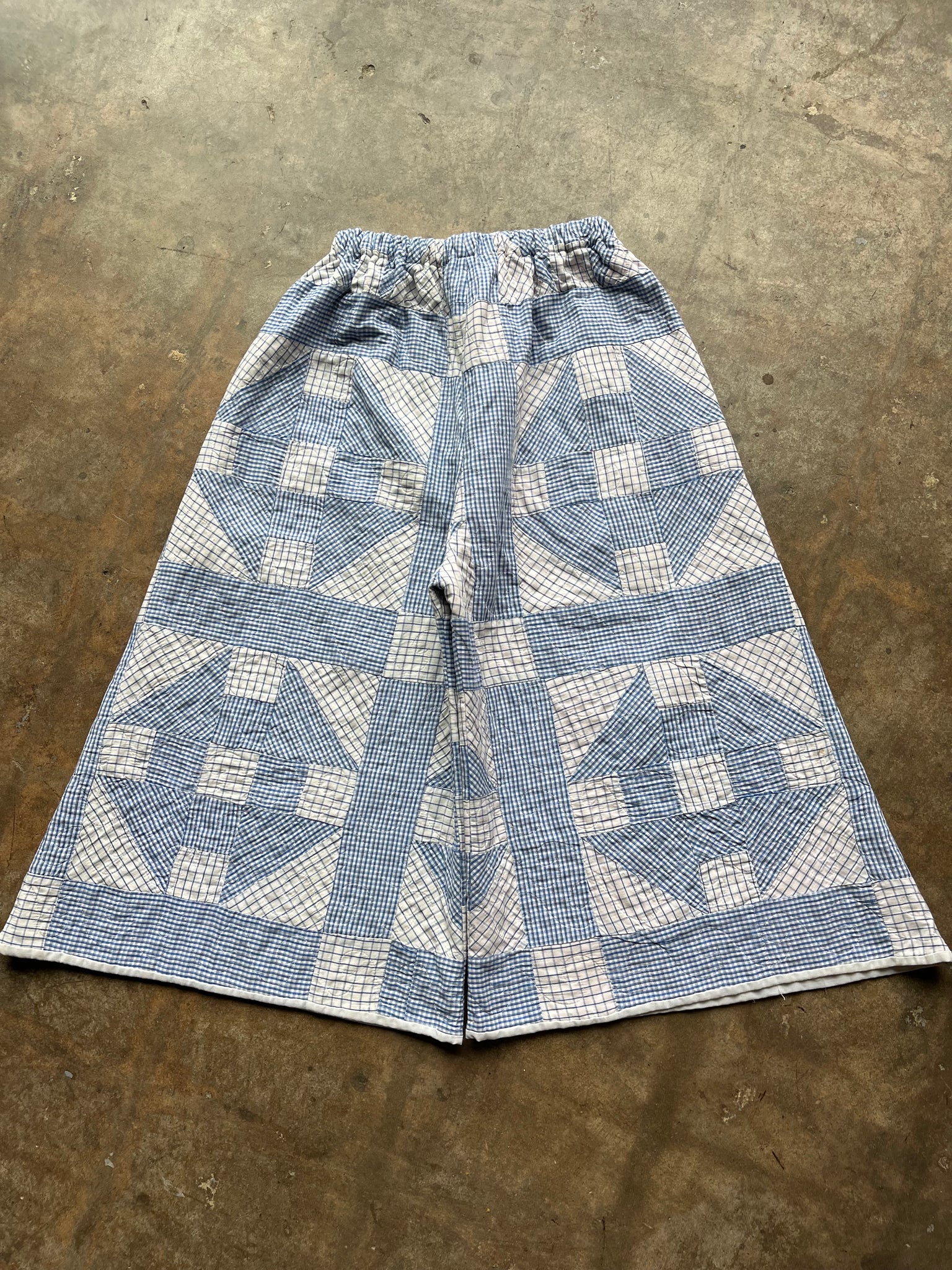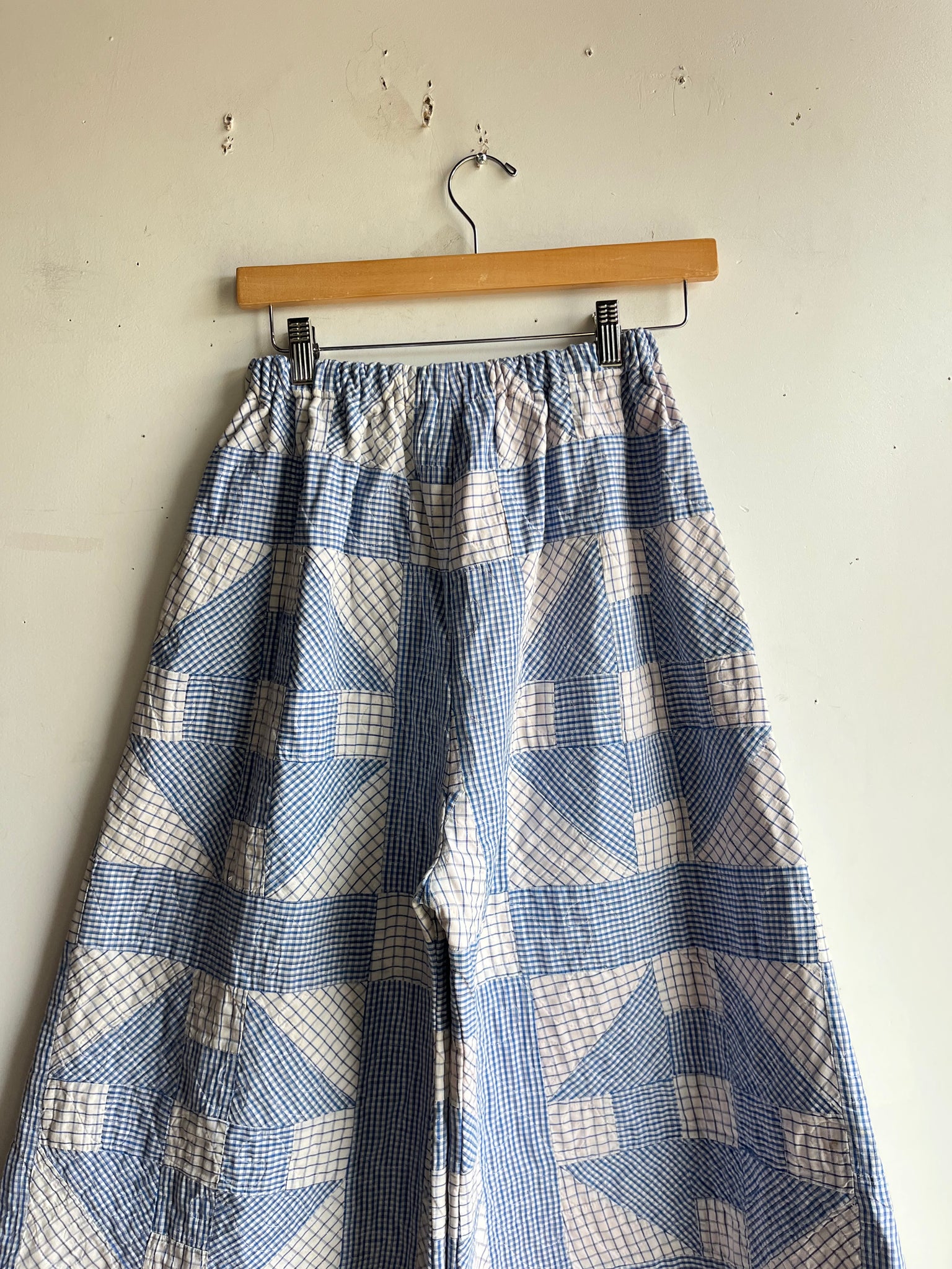 These pants are made from an Vintage Gingham Churn Dash Quilt. There is a batting between the two layers, but I would say this a light weight quilt. Judging by the fabric and style, I would say this is from the 1960s-1970s. This pant is made from a vintage palazzo pant pattern and features a wide leg, high waist, and elastic waist band to fit a variety of sizes. It also has inseam pockets for maximum comfort and utility :).