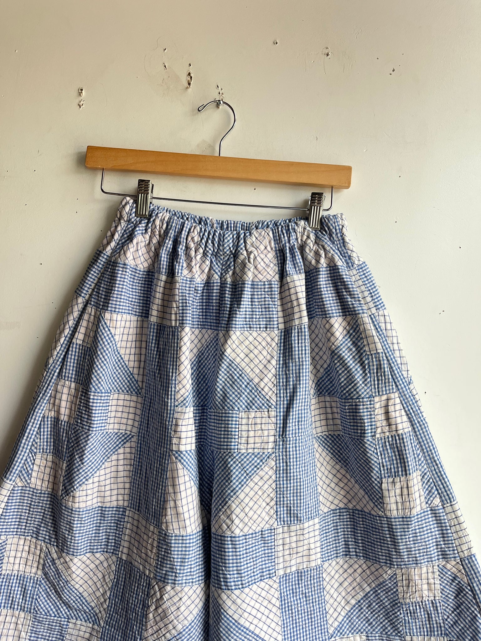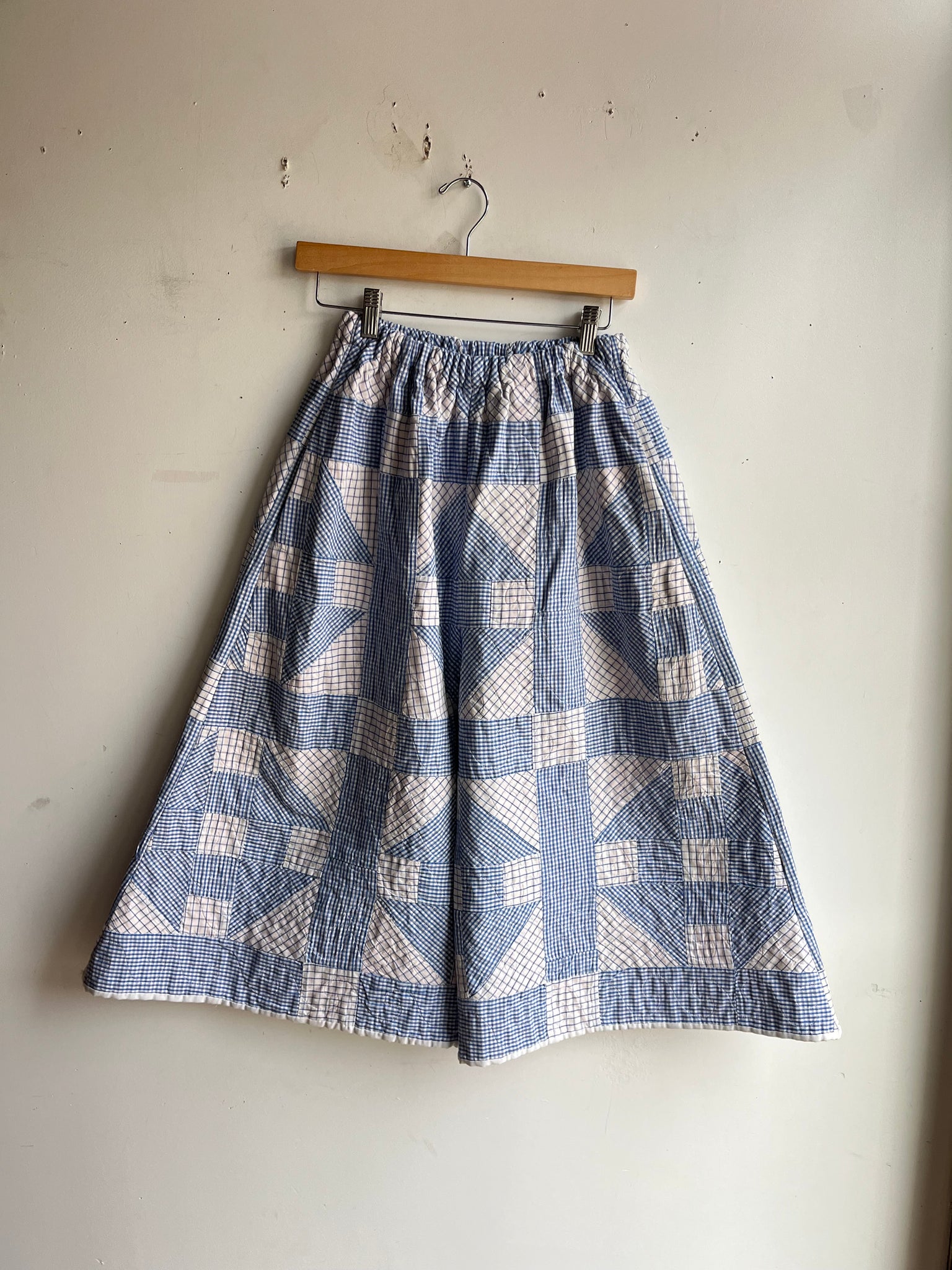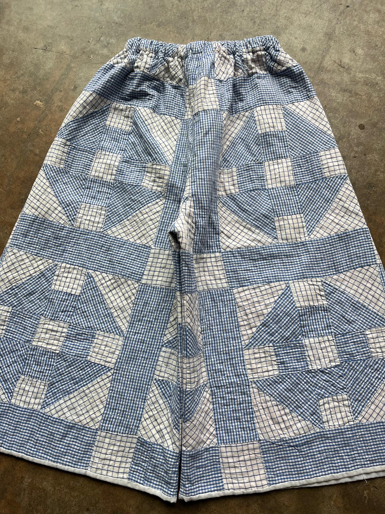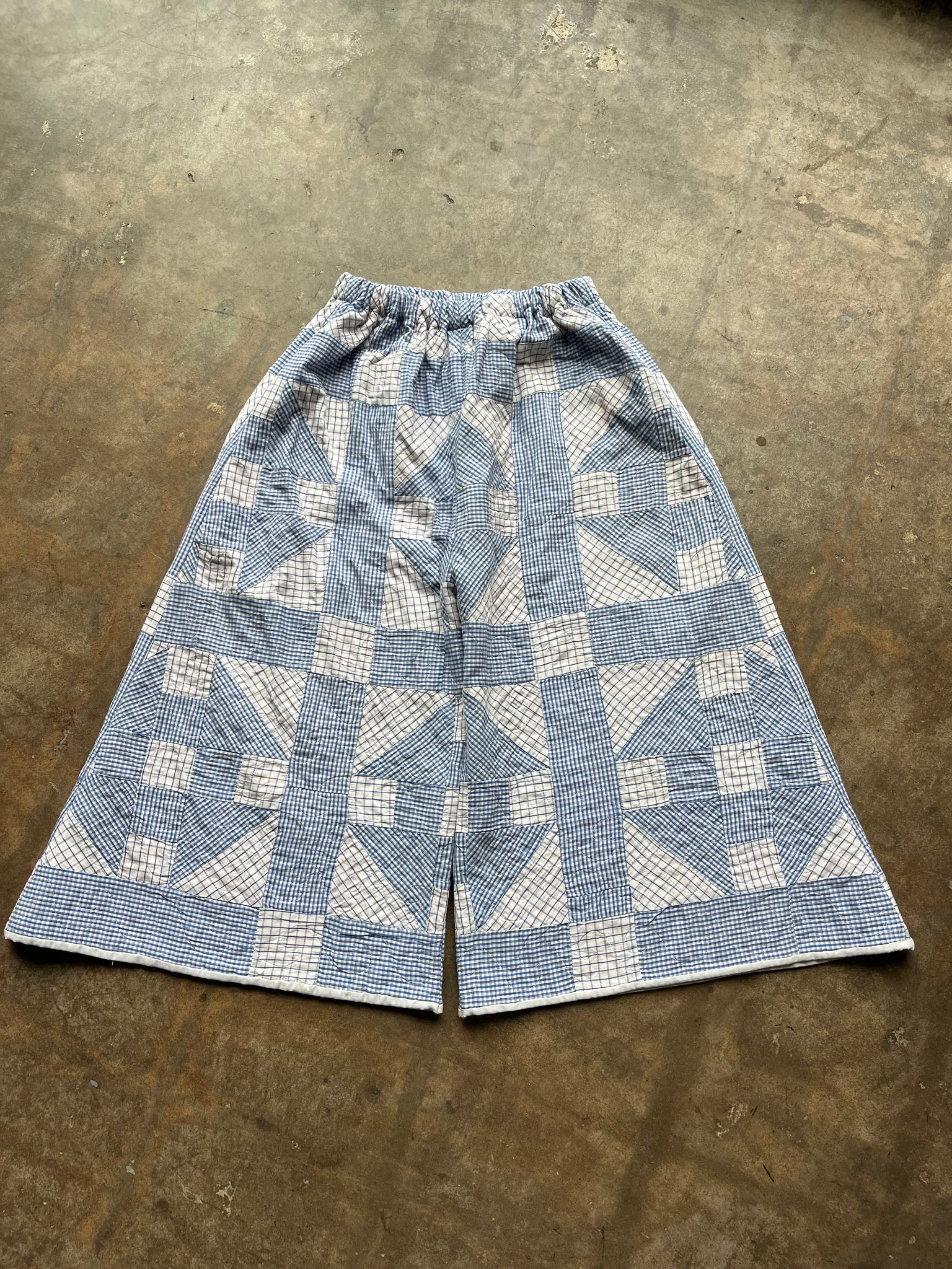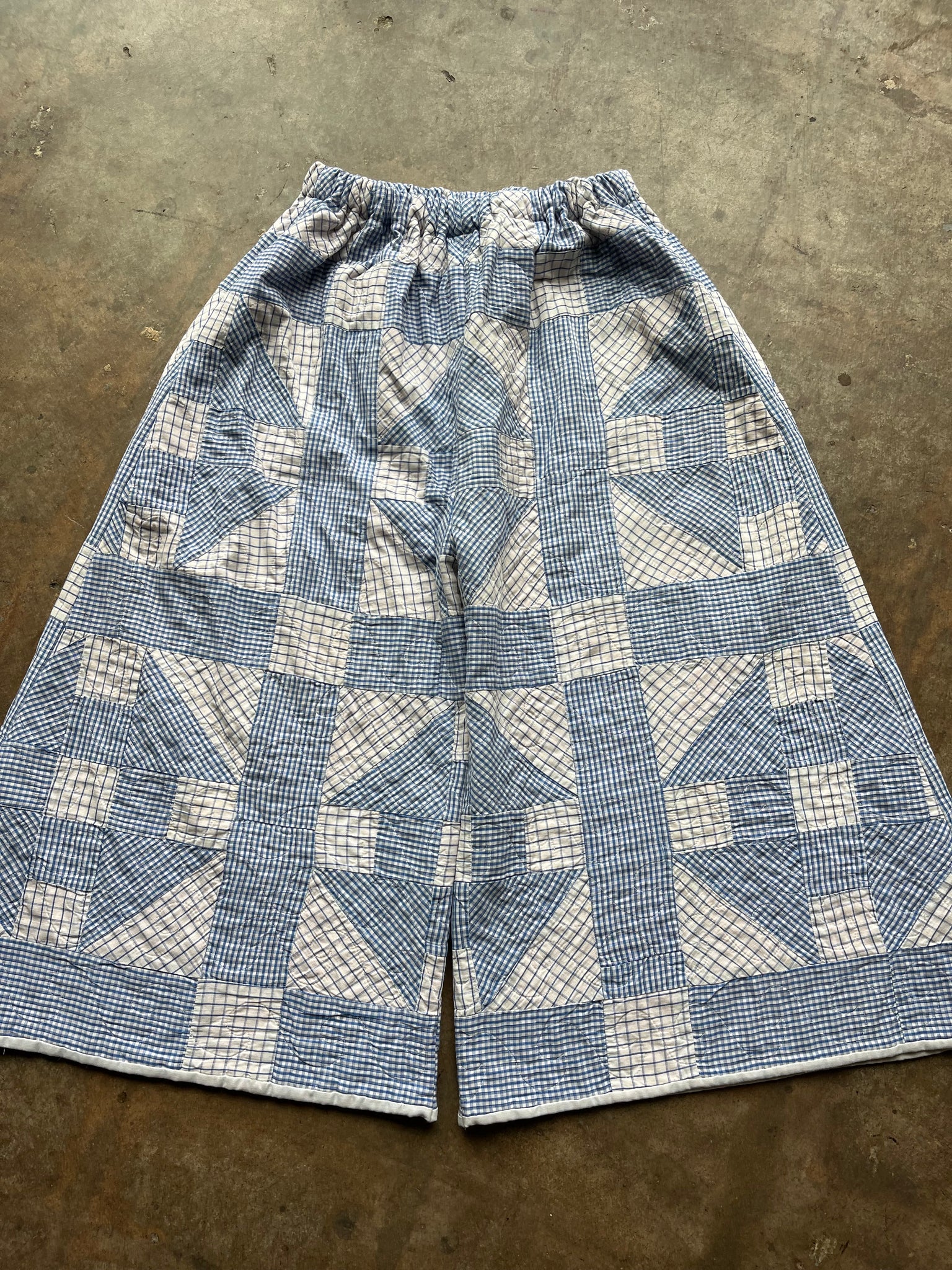 These pants are made from an Vintage Gingham Churn Dash Quilt. There is a batting between the two layers, but I would say this a light weight quilt. Judging by the fabric and style, I would say this is from the 1960s-1970s. This pant is made from a vintage palazzo pant pattern and features a wide leg, high waist, and elastic waist band to fit a variety of sizes. It also has inseam pockets for maximum comfort and utility :).