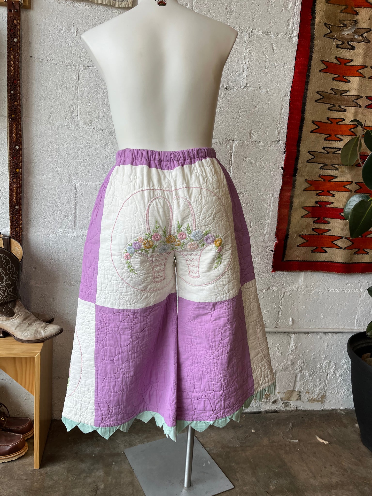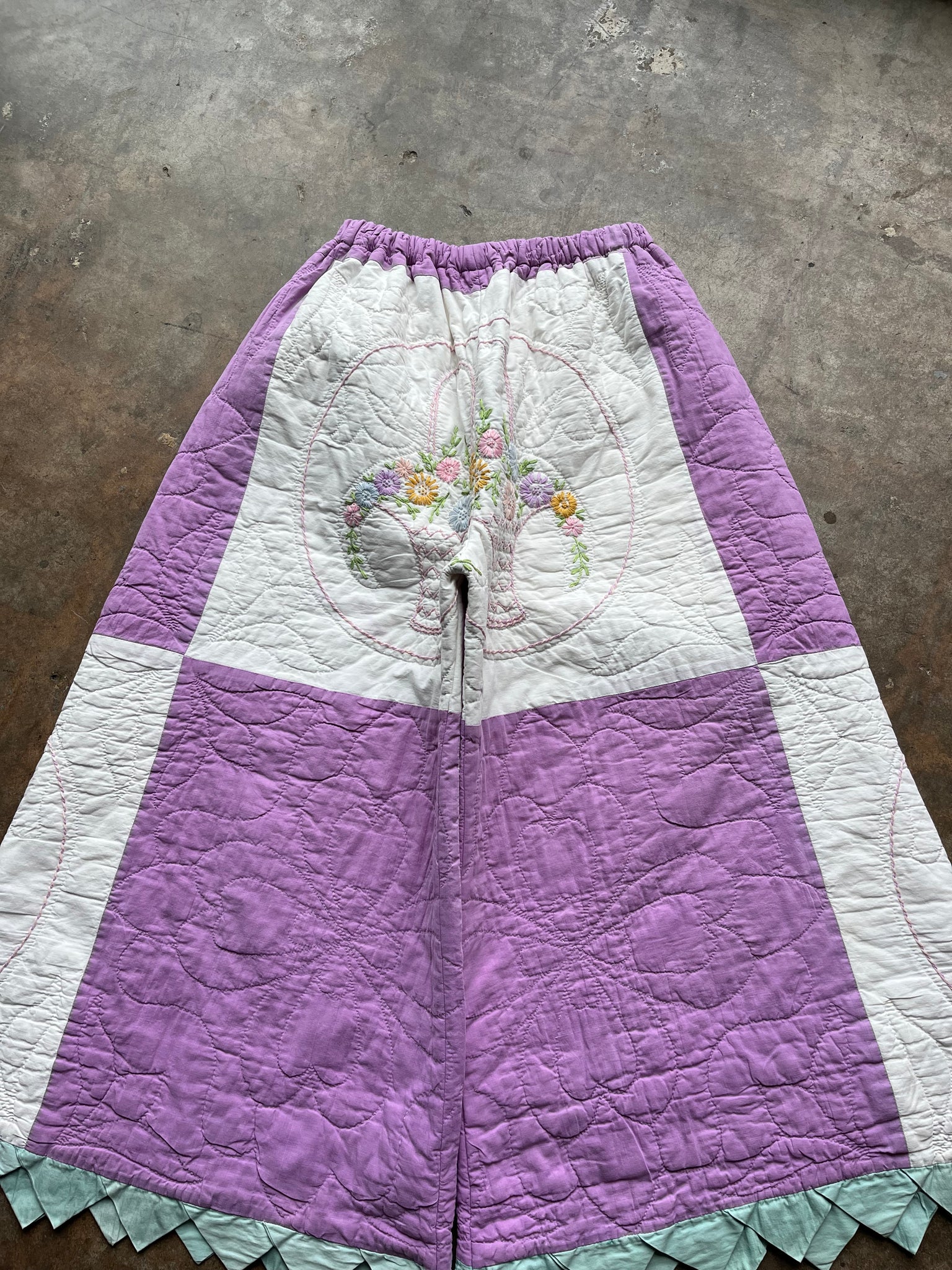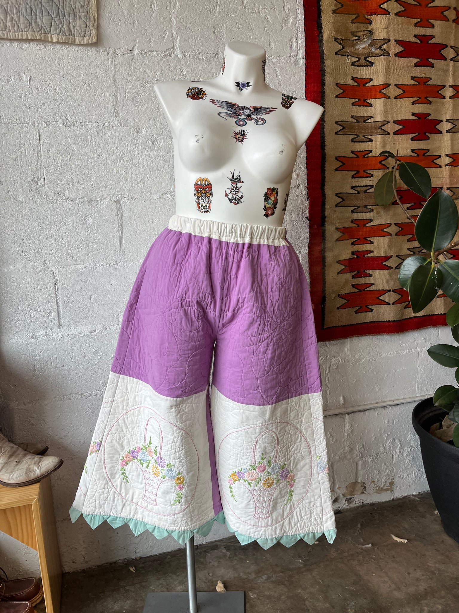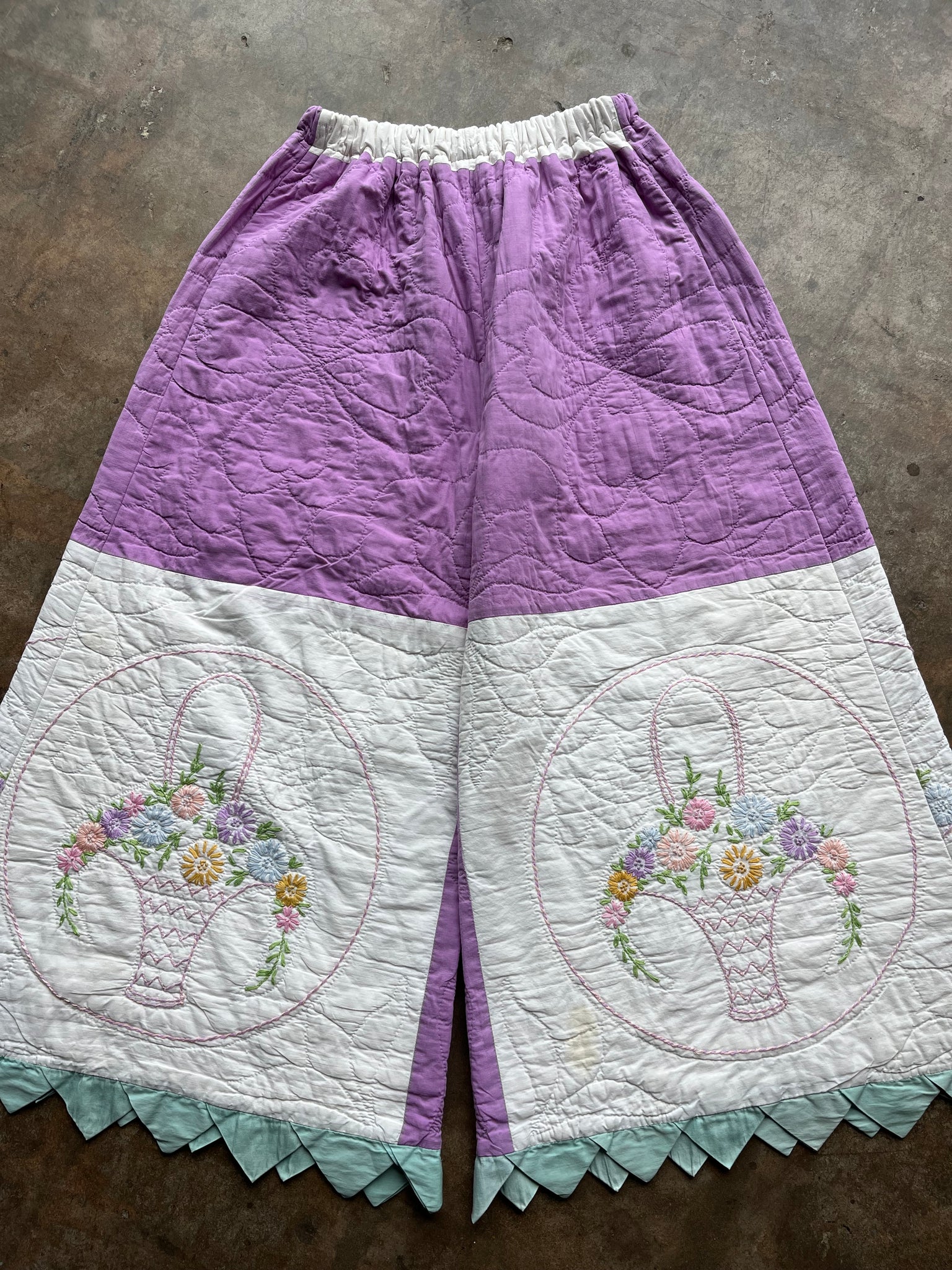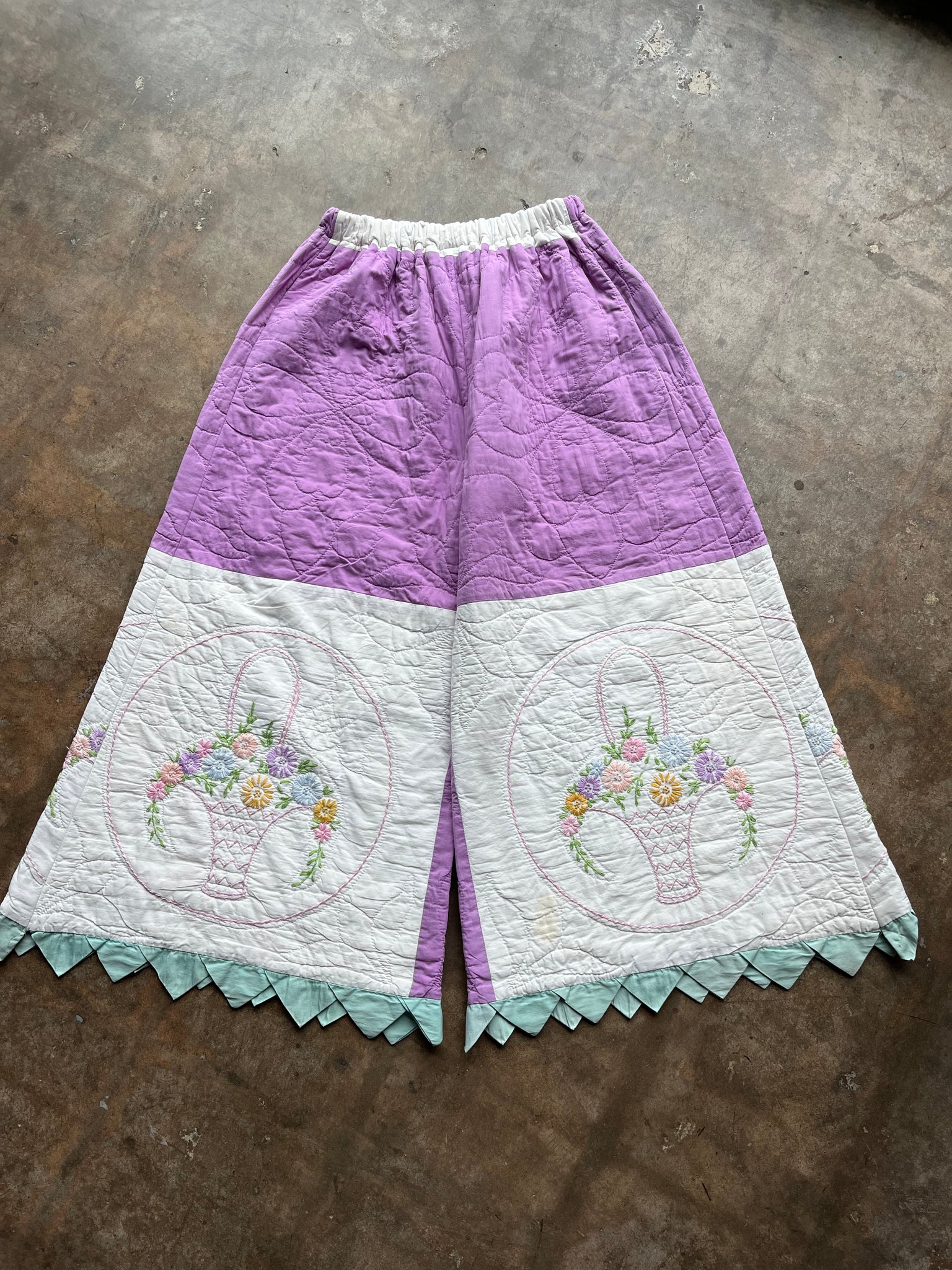 These pants are made from an Vintage Embroidered Flower Basked Quilt. There is a batting between the two layers, but I would say this a light weight quilt. Judging by the fabric, style, and that it is all hand stitched, I would say this is from the 1940s-1950s. This pant is made from a vintage palazzo pant pattern and features a wide leg, high waist, and elastic waist band to fit a variety of sizes. It also has inseam pockets for maximum comfort and utility :)