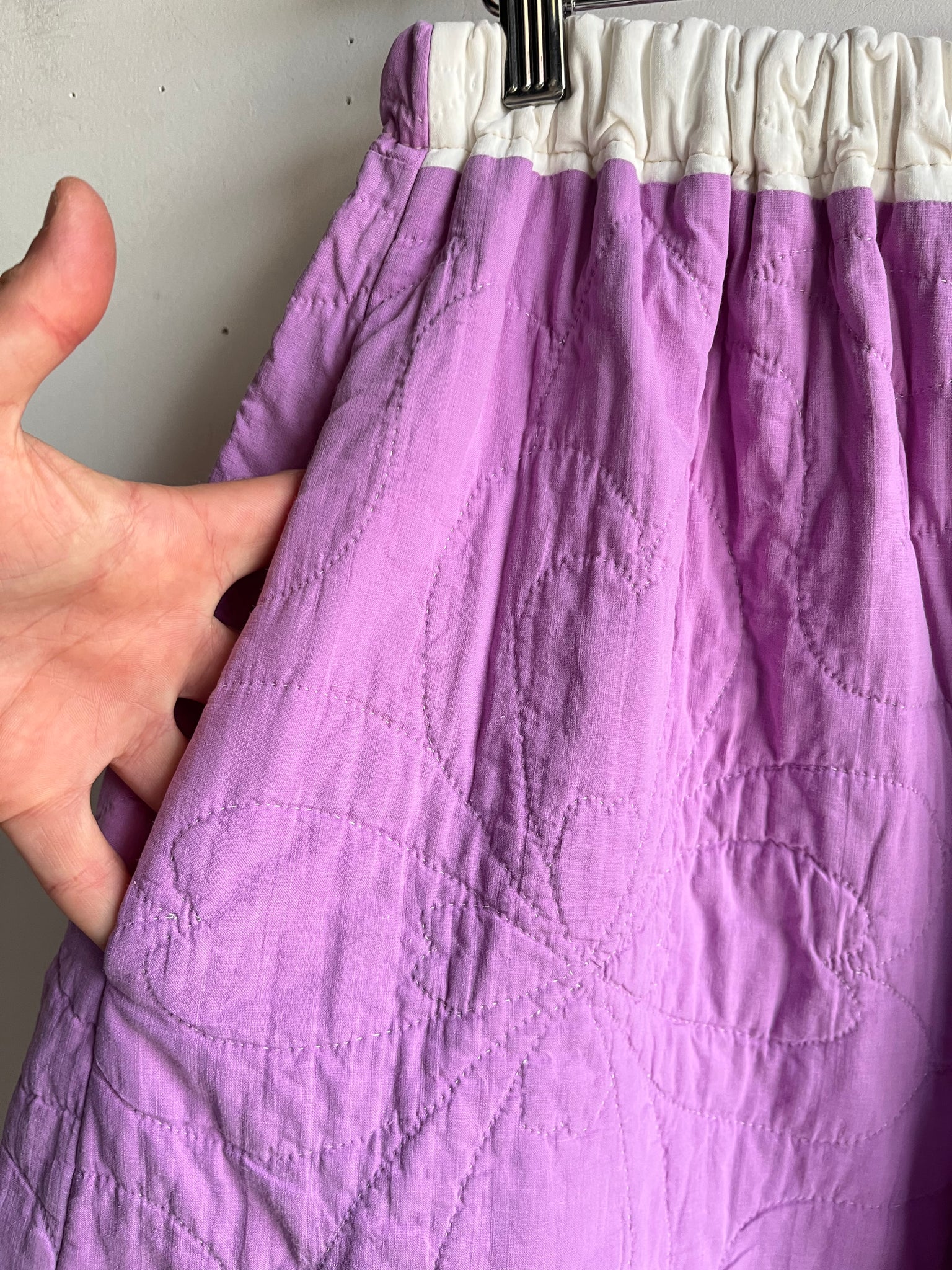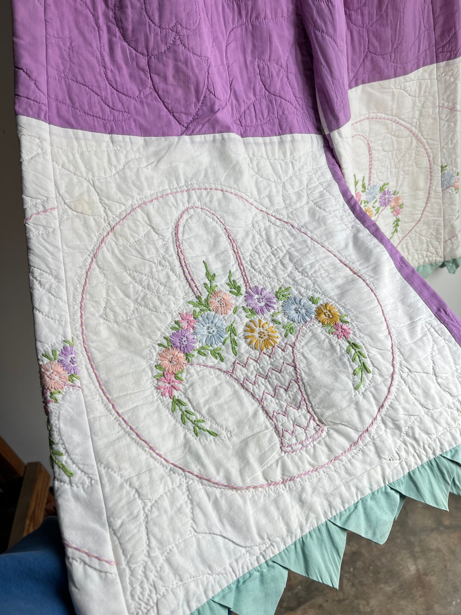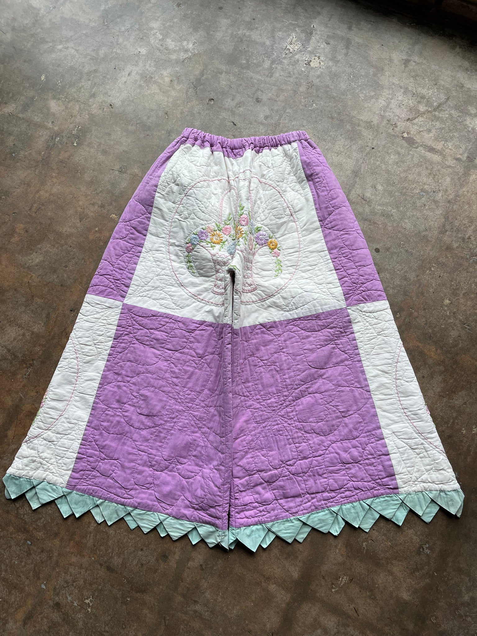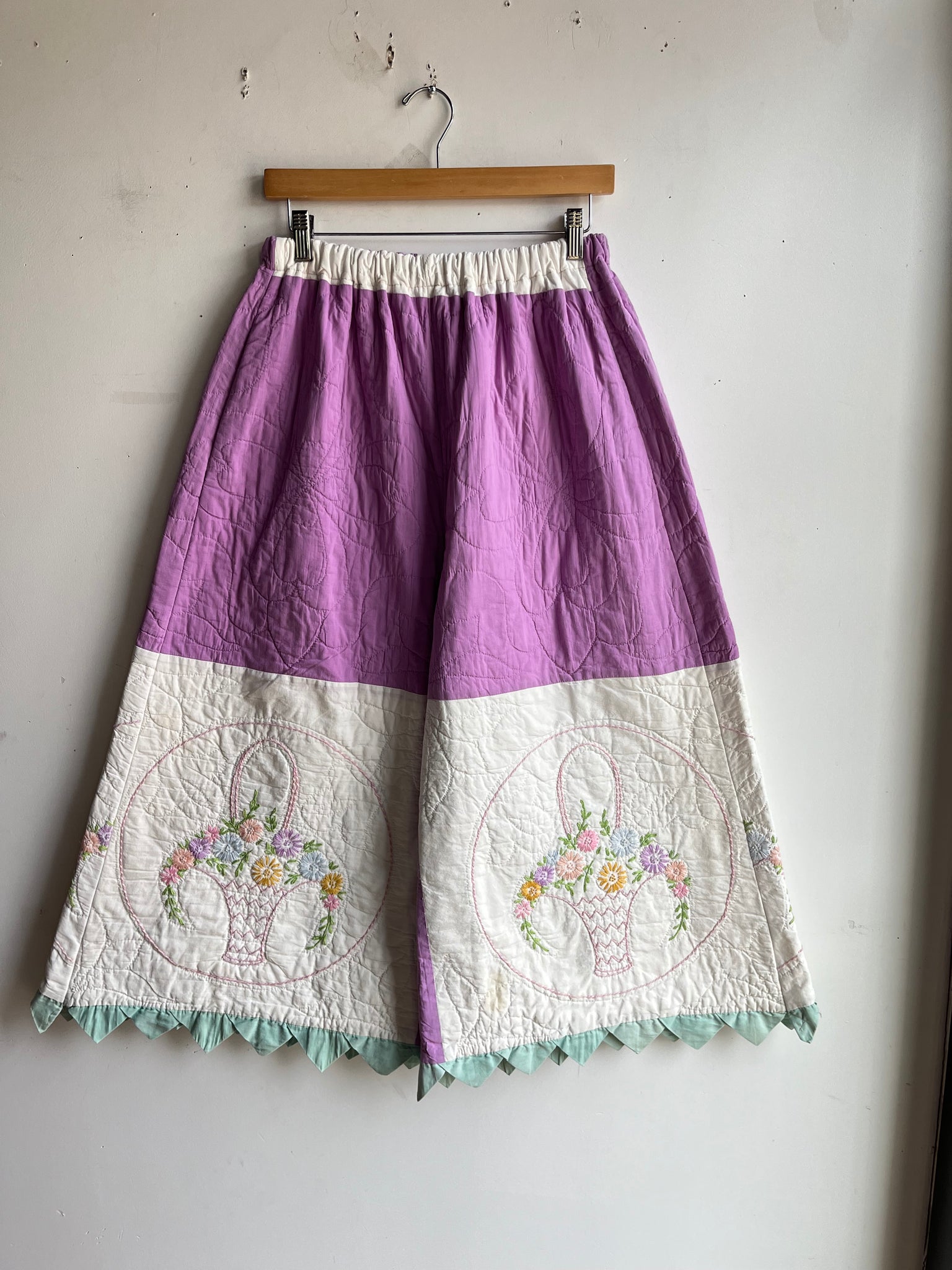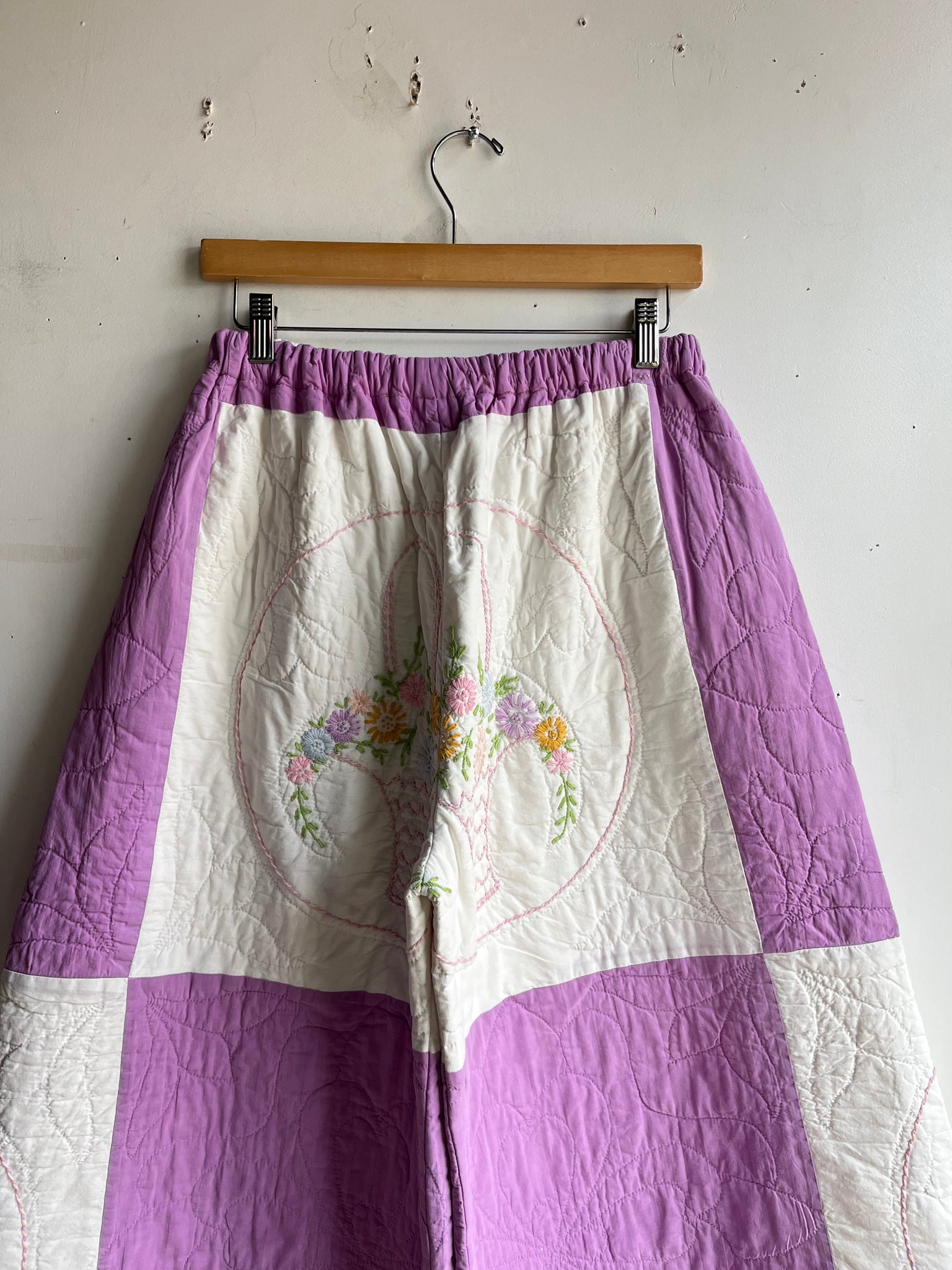 These pants are made from an Vintage Embroidered Flower Basked Quilt. There is a batting between the two layers, but I would say this a light weight quilt. Judging by the fabric, style, and that it is all hand stitched, I would say this is from the 1940s-1950s. This pant is made from a vintage palazzo pant pattern and features a wide leg, high waist, and elastic waist band to fit a variety of sizes. It also has inseam pockets for maximum comfort and utility :)