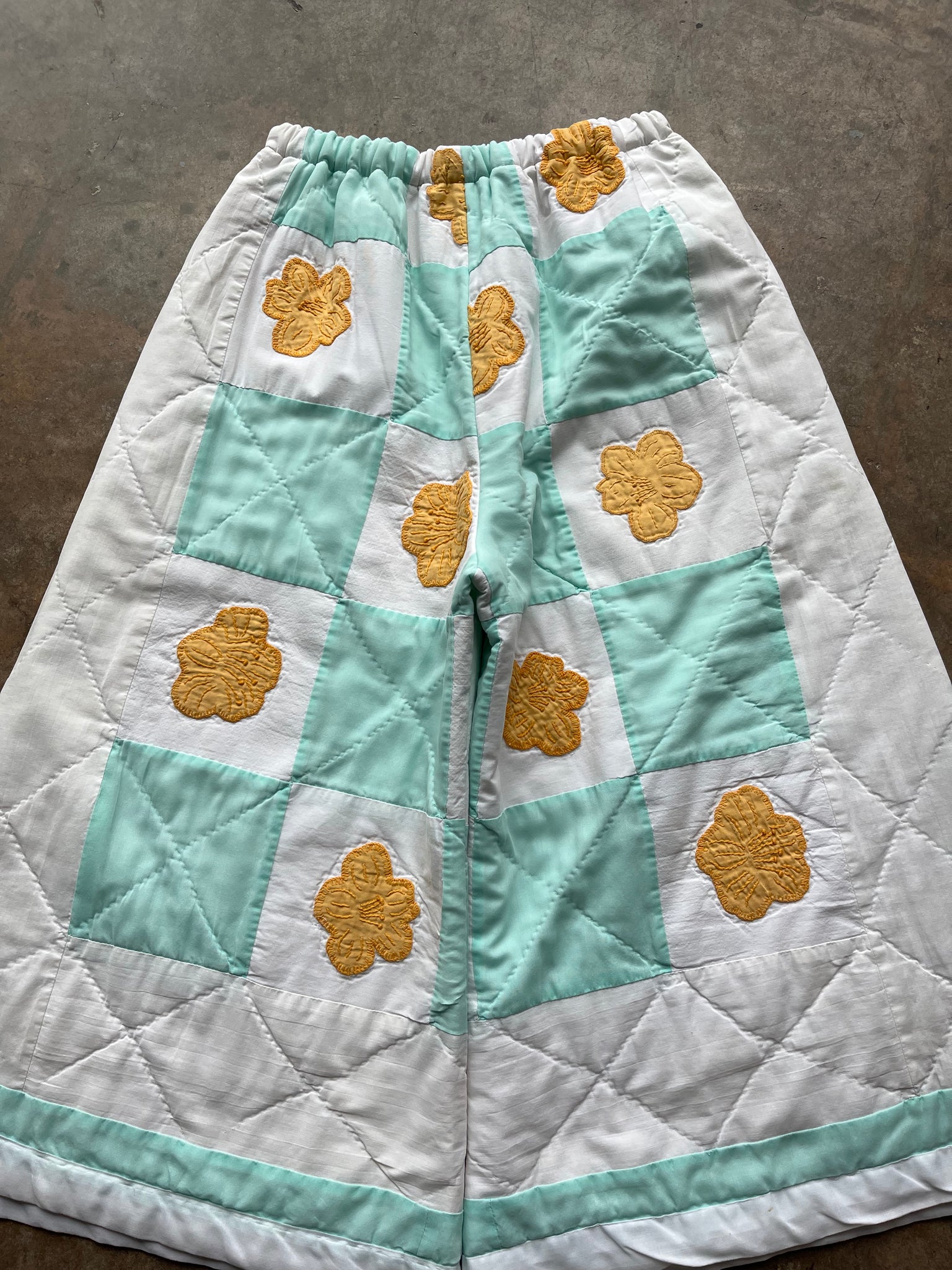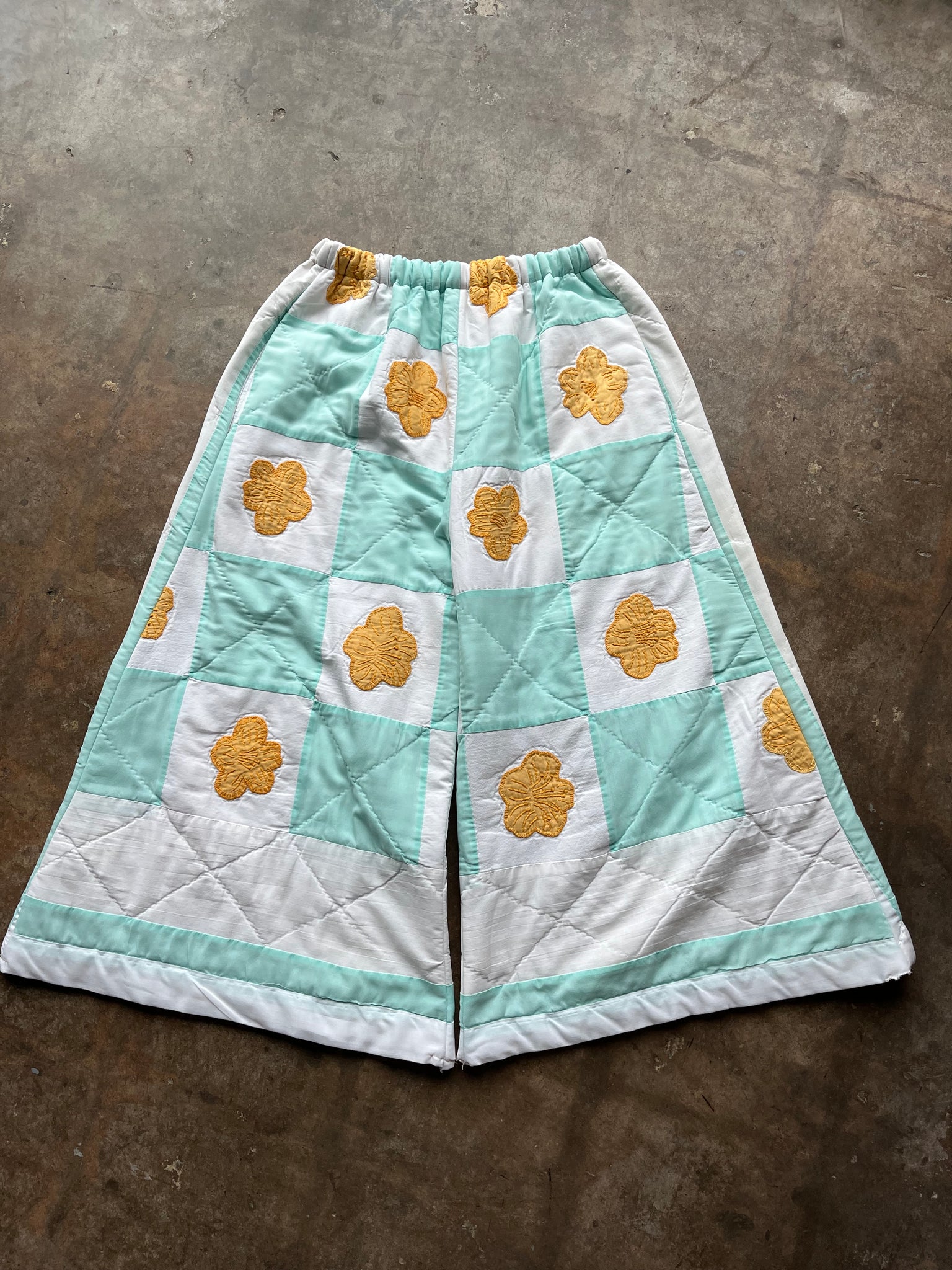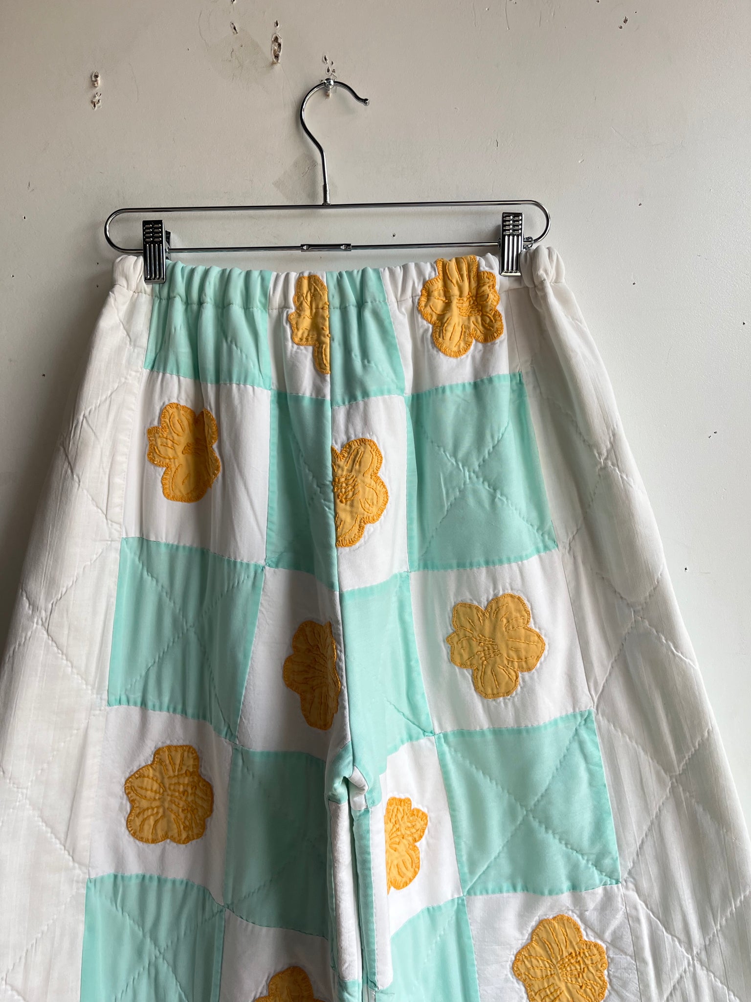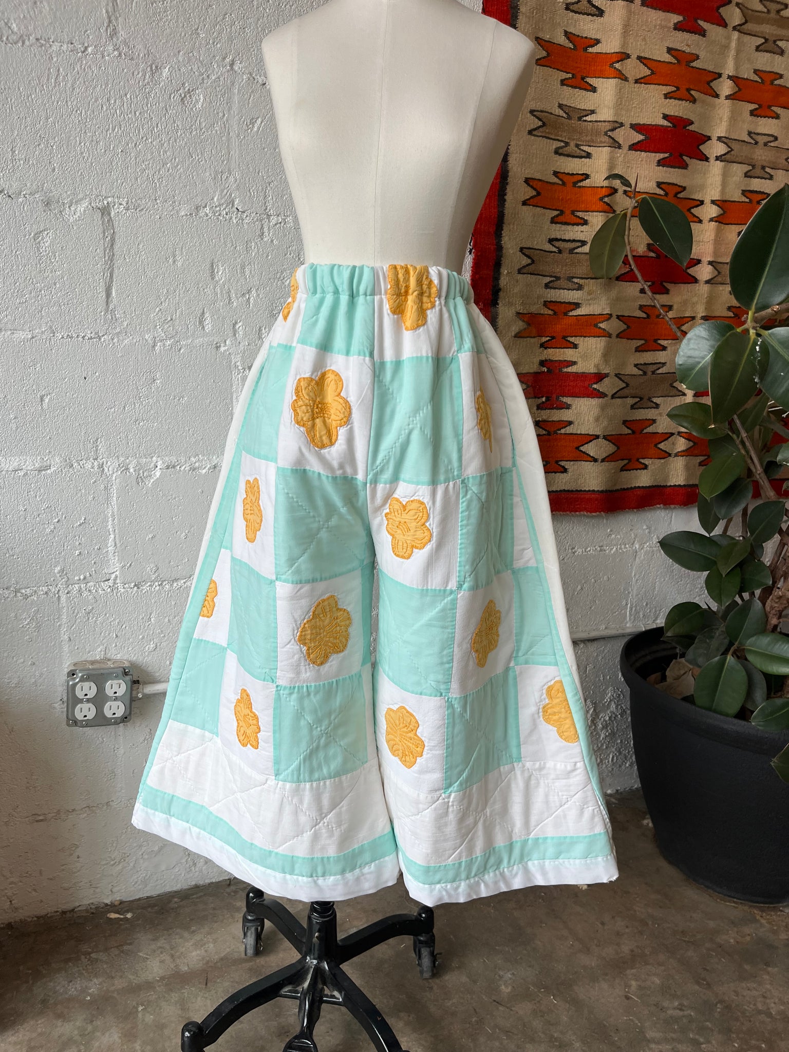 These pants are made from an Vintage checkered quilt with hand embroidered marigold flower appliques. There is a batting between the two layers, but I would say this a light weight quilt. Judging by the fabric, style, and that it is all hand stitched, I would say this is from the 1950s-1960s. This pant is made from a vintage palazzo pant pattern and features a wide leg, high waist, and elastic waist band to fit a variety of sizes. It also has inseam pockets for maximum comfort and utility :).