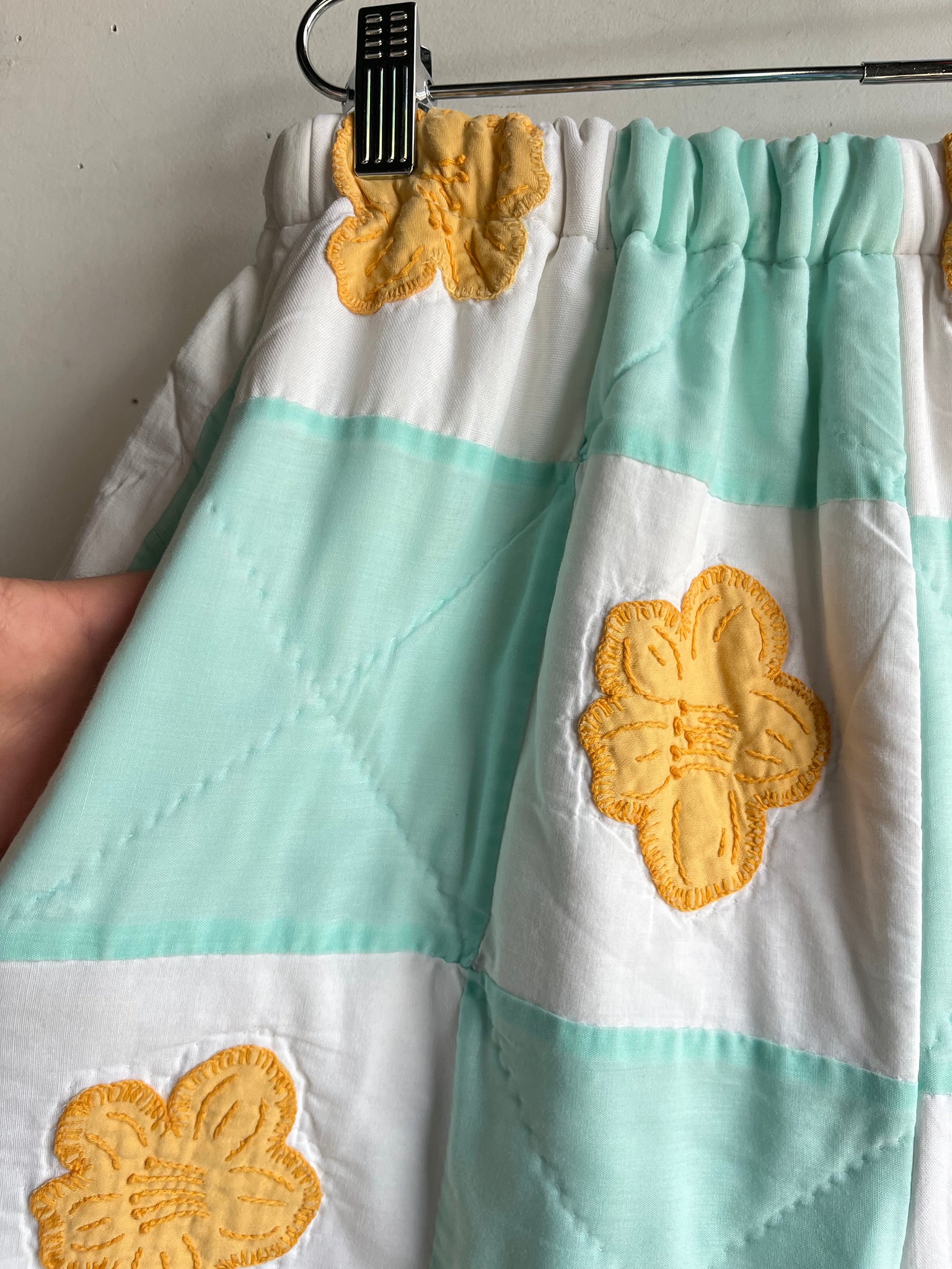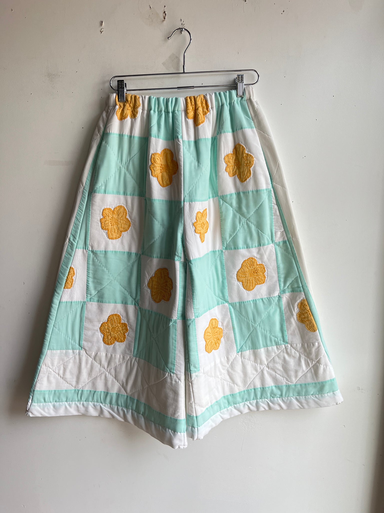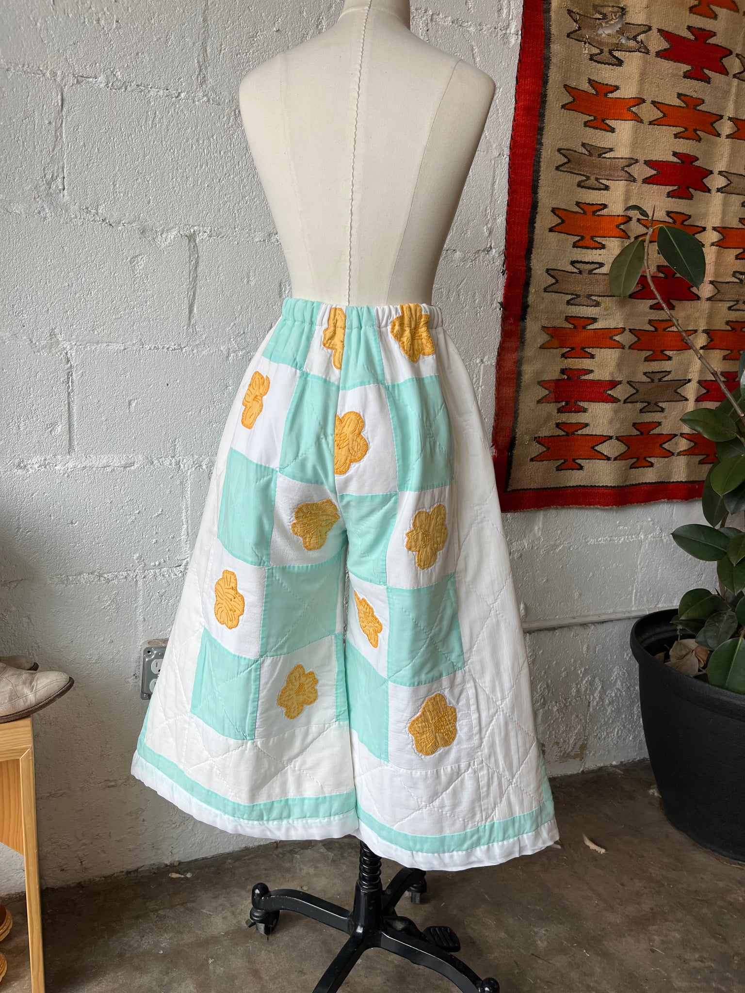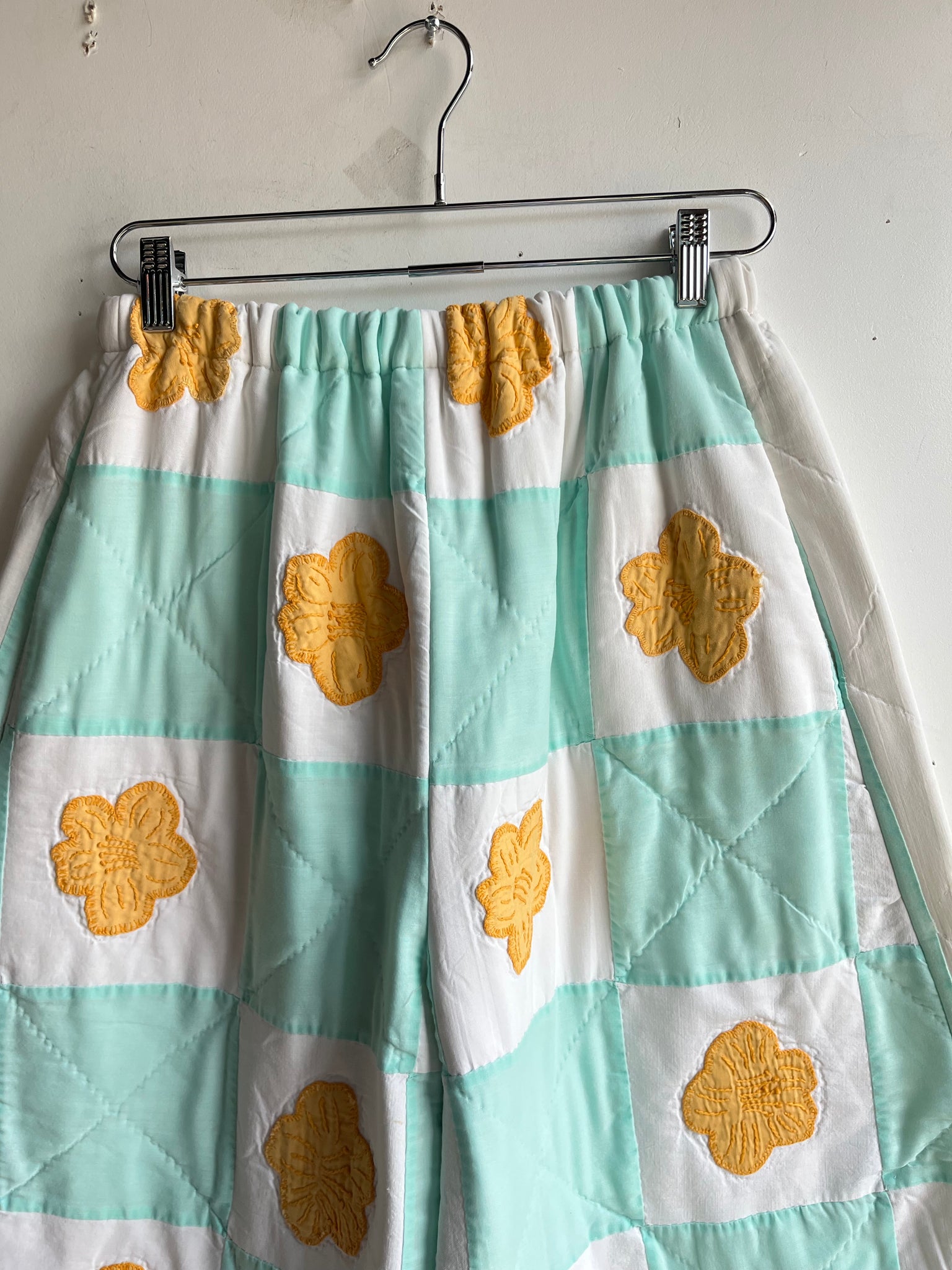 These pants are made from an Vintage checkered quilt with hand embroidered marigold flower appliques. There is a batting between the two layers, but I would say this a light weight quilt. Judging by the fabric, style, and that it is all hand stitched, I would say this is from the 1950s-1960s. This pant is made from a vintage palazzo pant pattern and features a wide leg, high waist, and elastic waist band to fit a variety of sizes. It also has inseam pockets for maximum comfort and utility :).