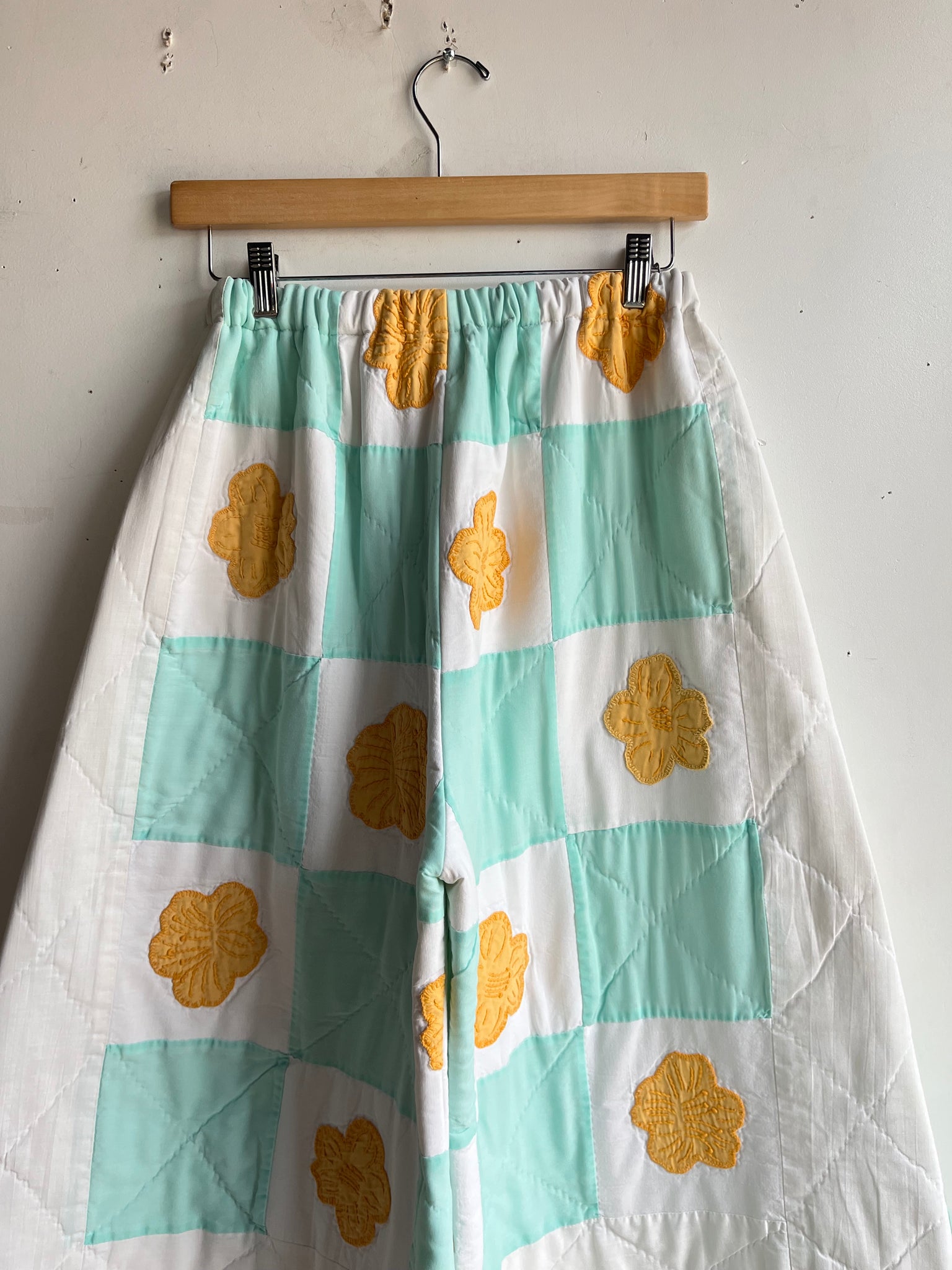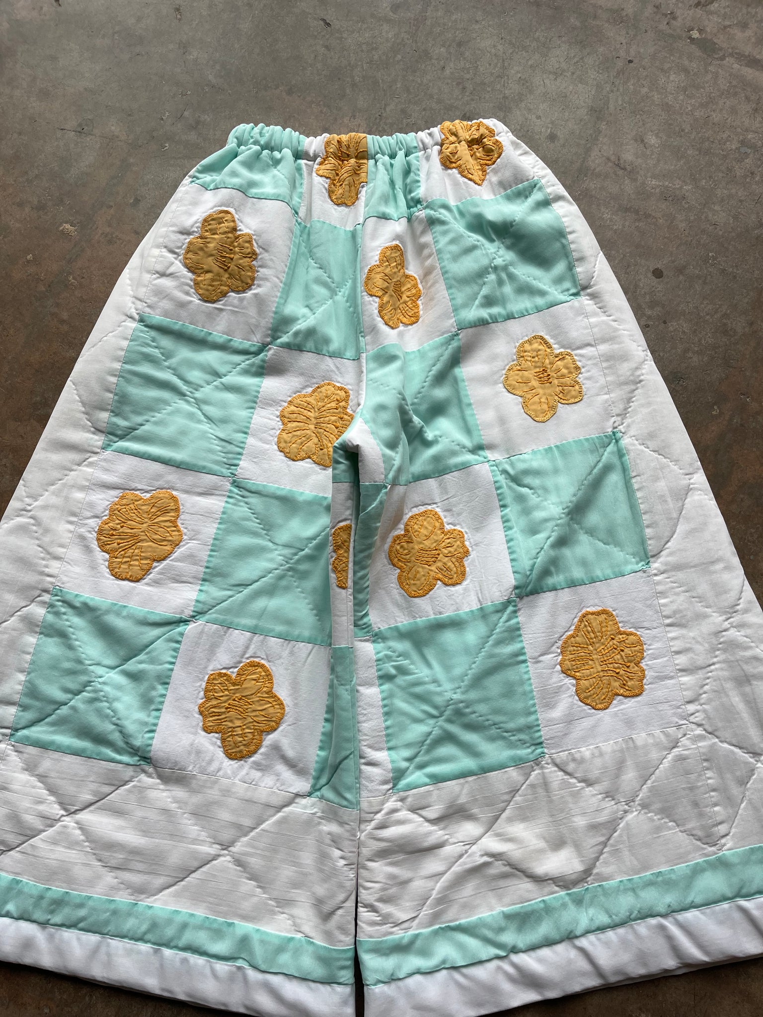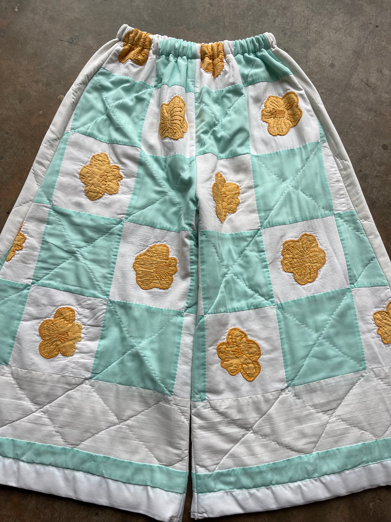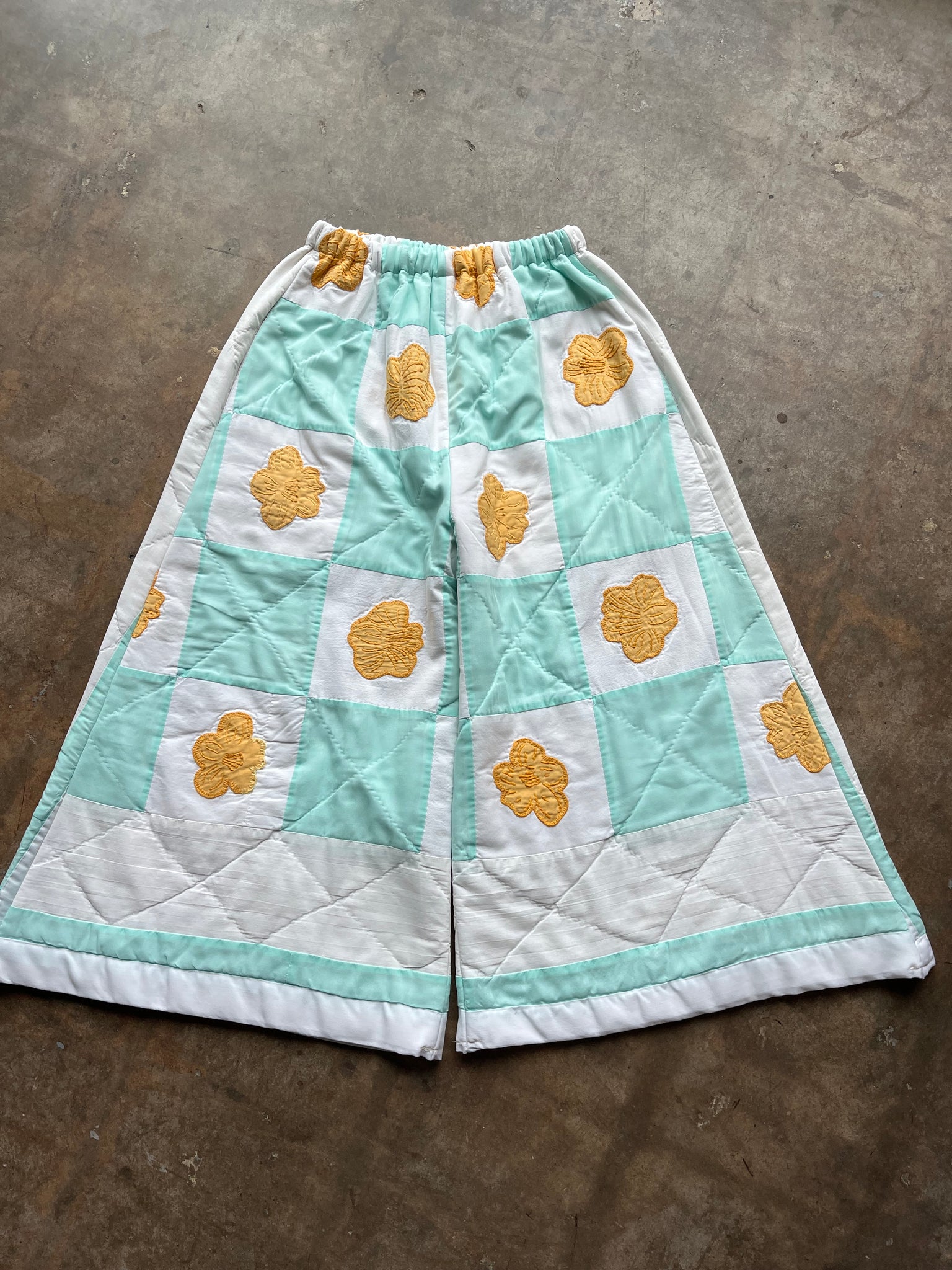 These pants are made from an Vintage checkered quilt with hand embroidered marigold flower appliques. There is a batting between the two layers, but I would say this a light weight quilt. Judging by the fabric, style, and that it is all hand stitched, I would say this is from the 1950s-1960s. This pant is made from a vintage palazzo pant pattern and features a wide leg, high waist, and elastic waist band to fit a variety of sizes. It also has inseam pockets for maximum comfort and utility :)