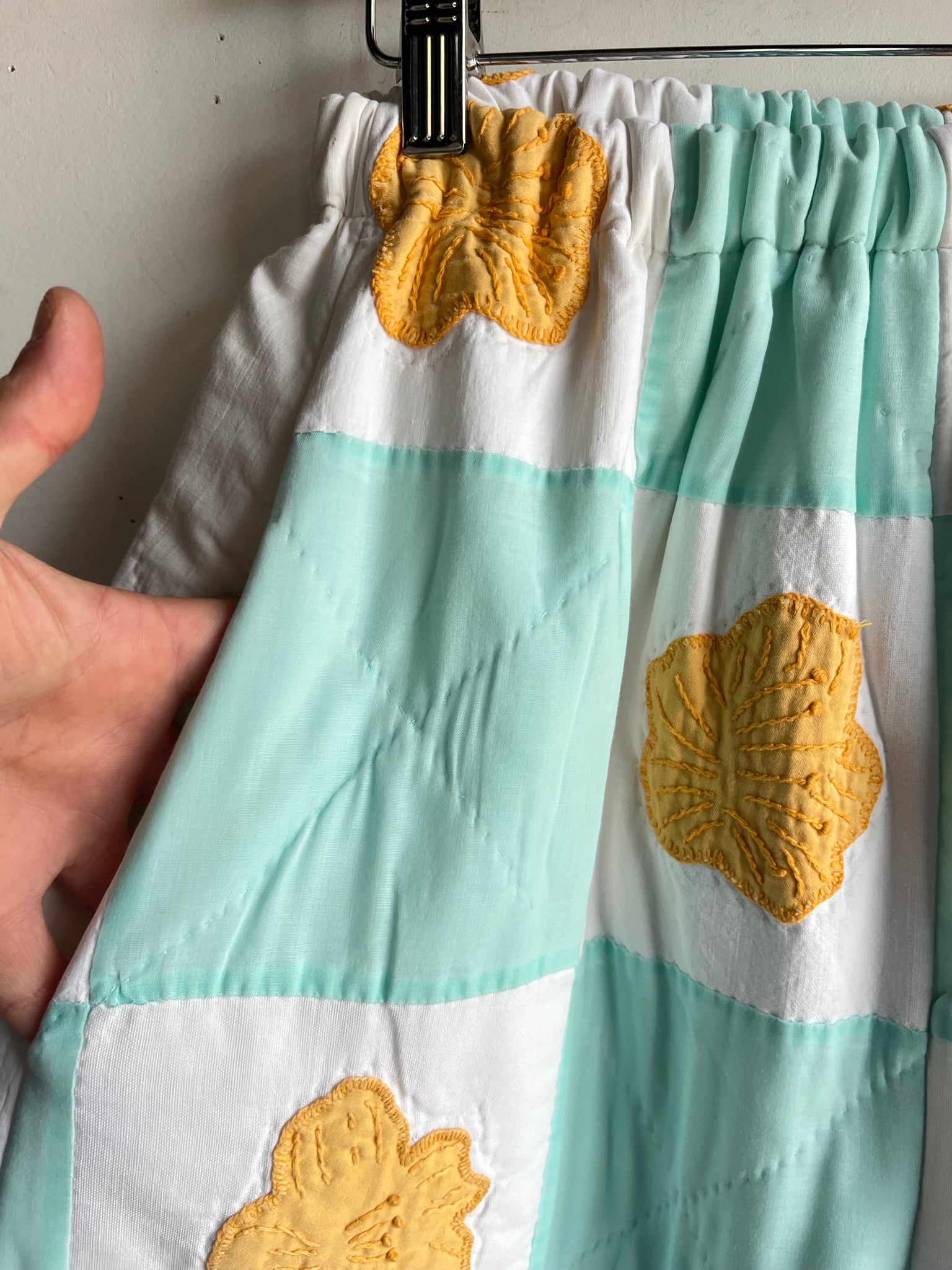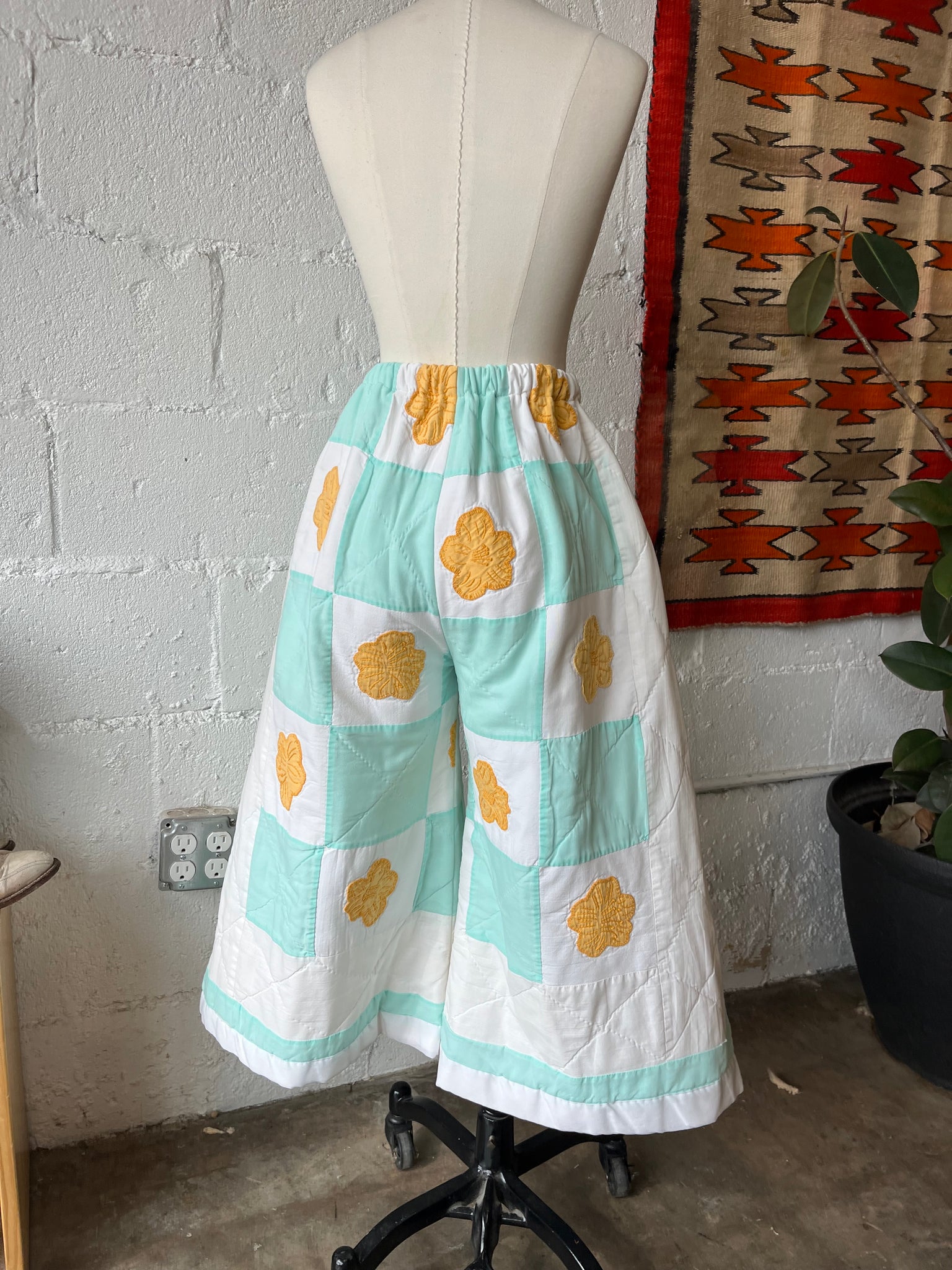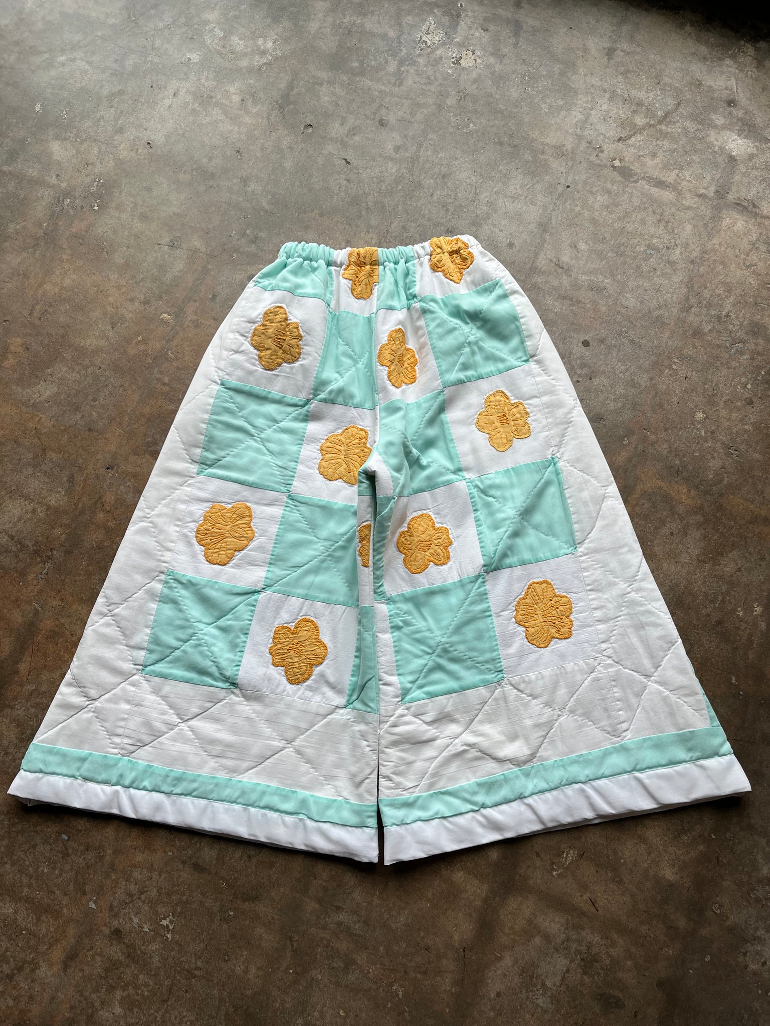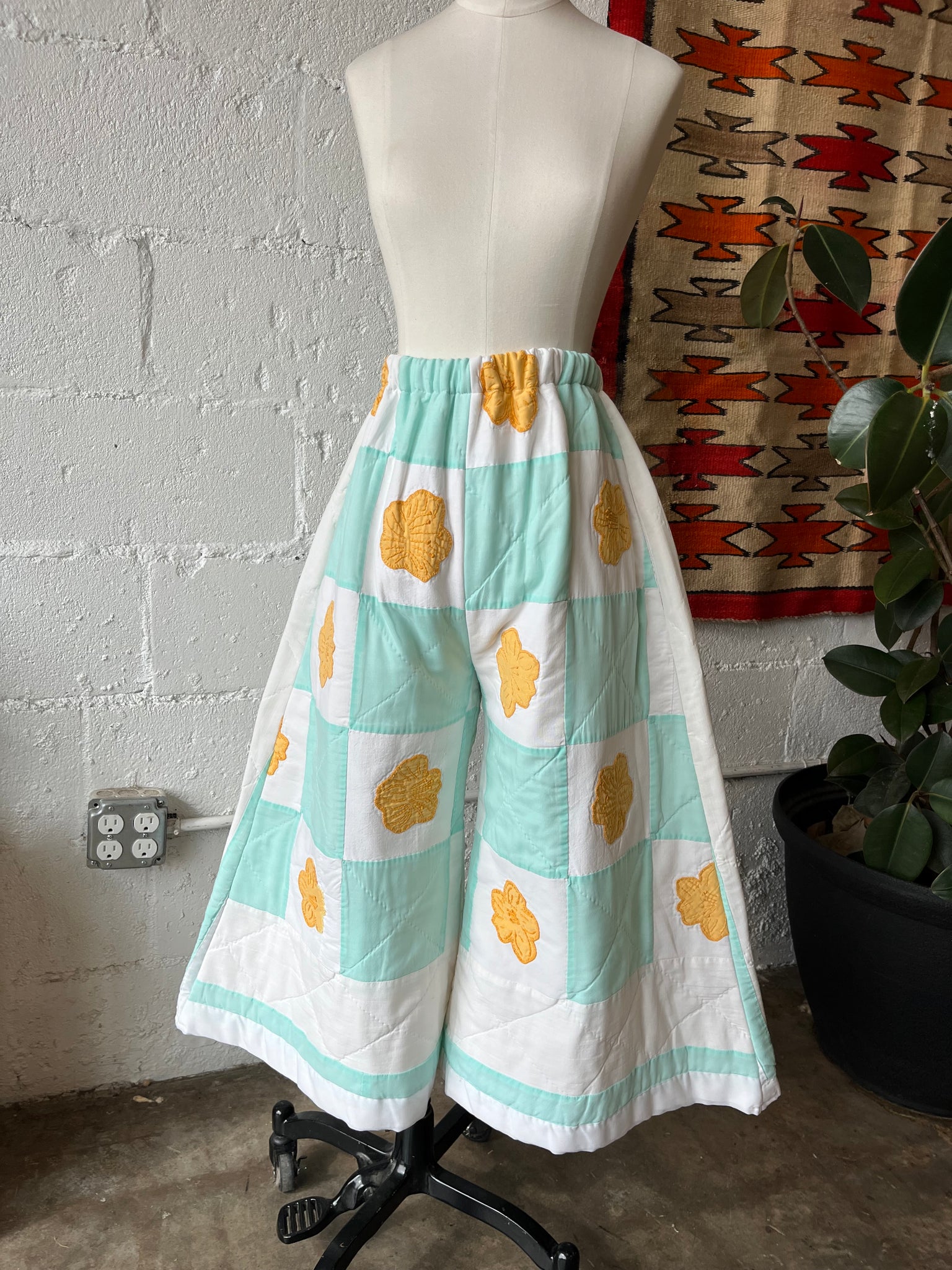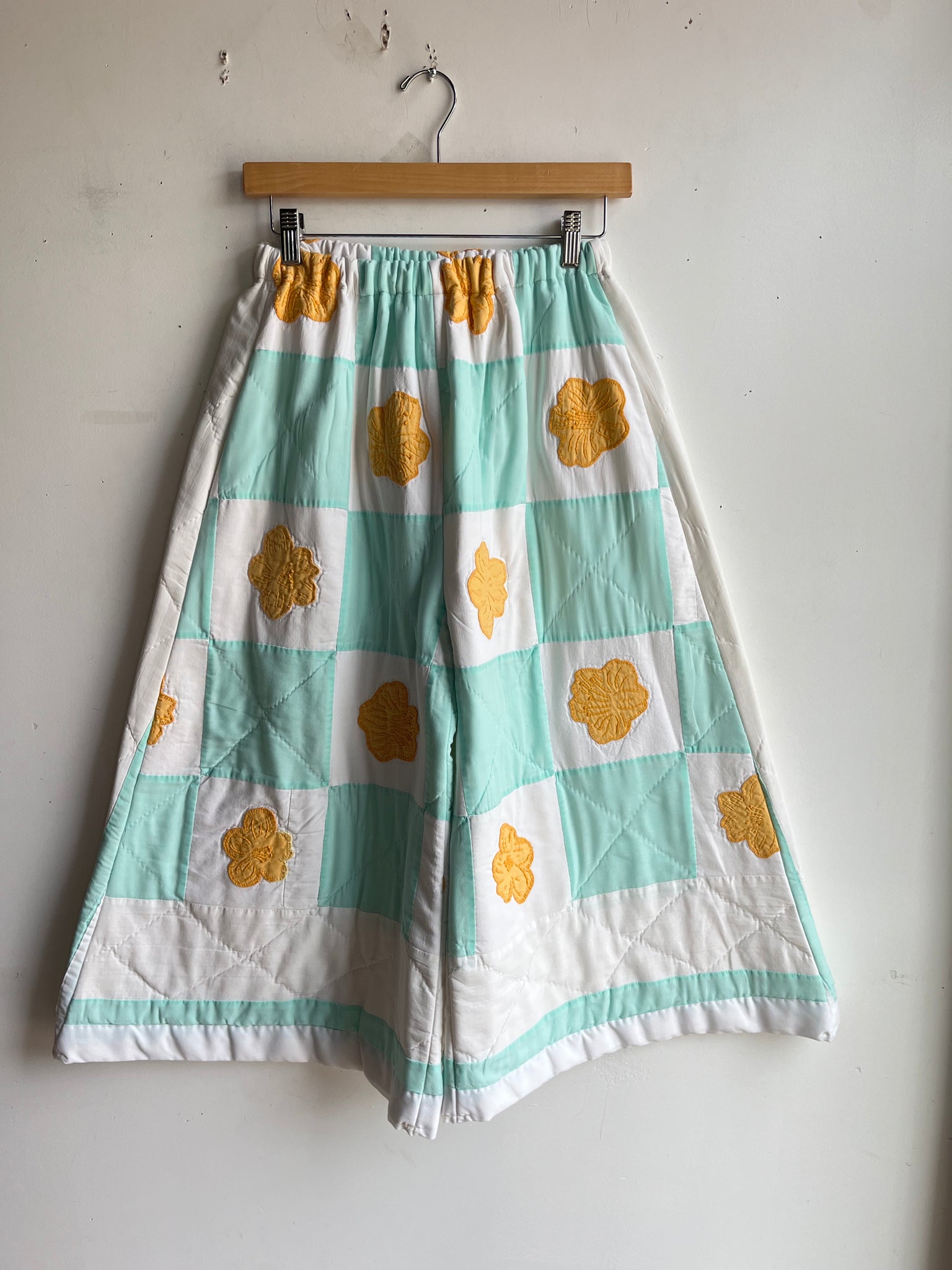 These pants are made from an Vintage checkered quilt with hand embroidered marigold flower appliques. There is a batting between the two layers, but I would say this a light weight quilt. Judging by the fabric, style, and that it is all hand stitched, I would say this is from the 1950s-1960s. This pant is made from a vintage palazzo pant pattern and features a wide leg, high waist, and elastic waist band to fit a variety of sizes. It also has inseam pockets for maximum comfort and utility :)