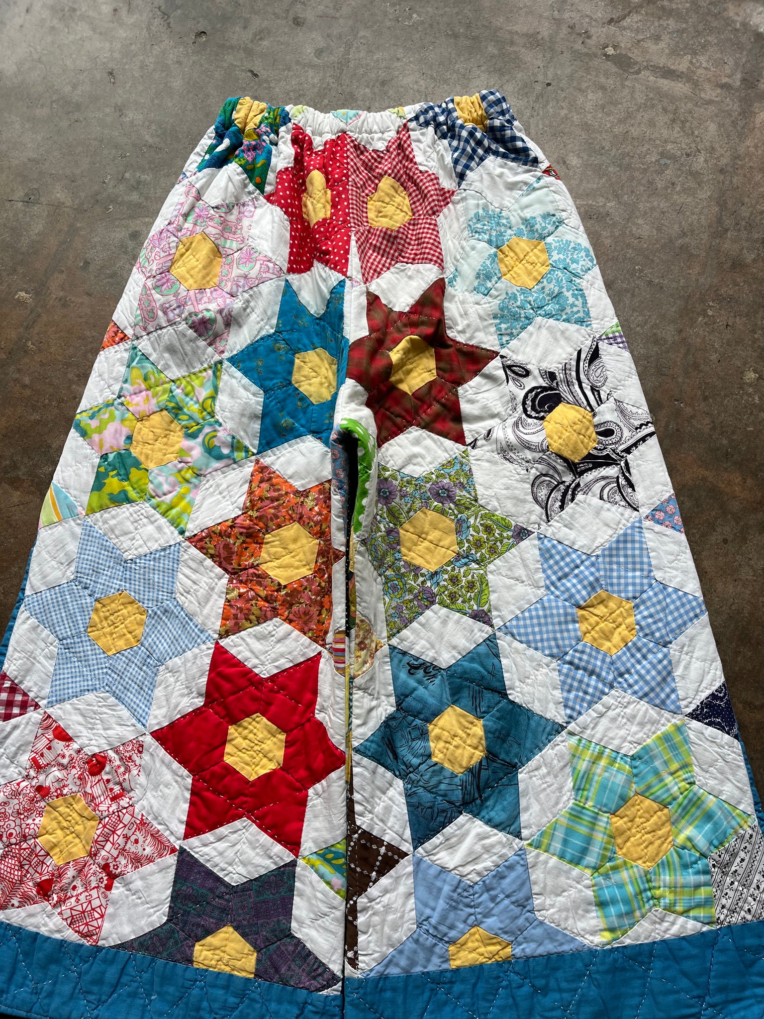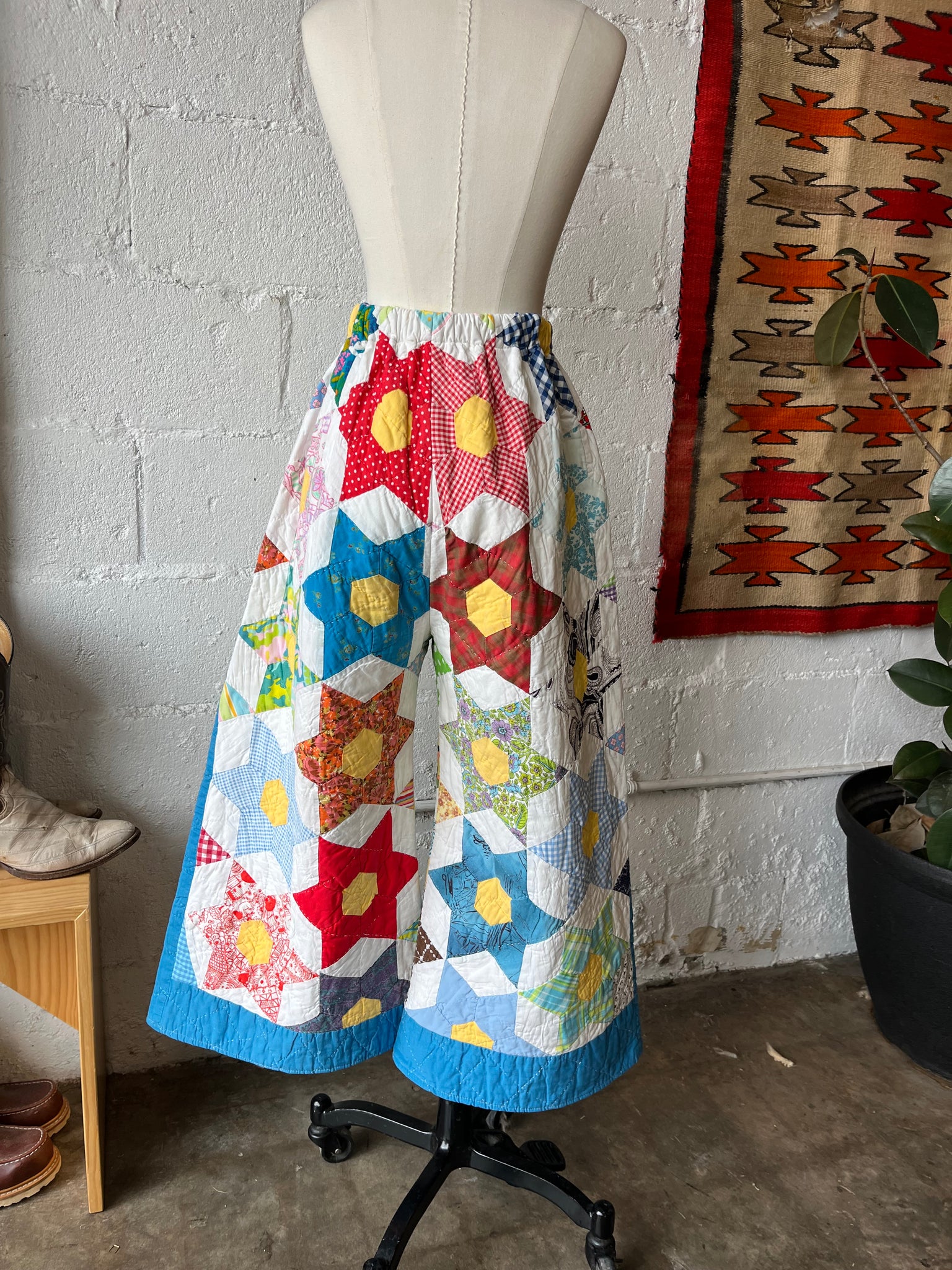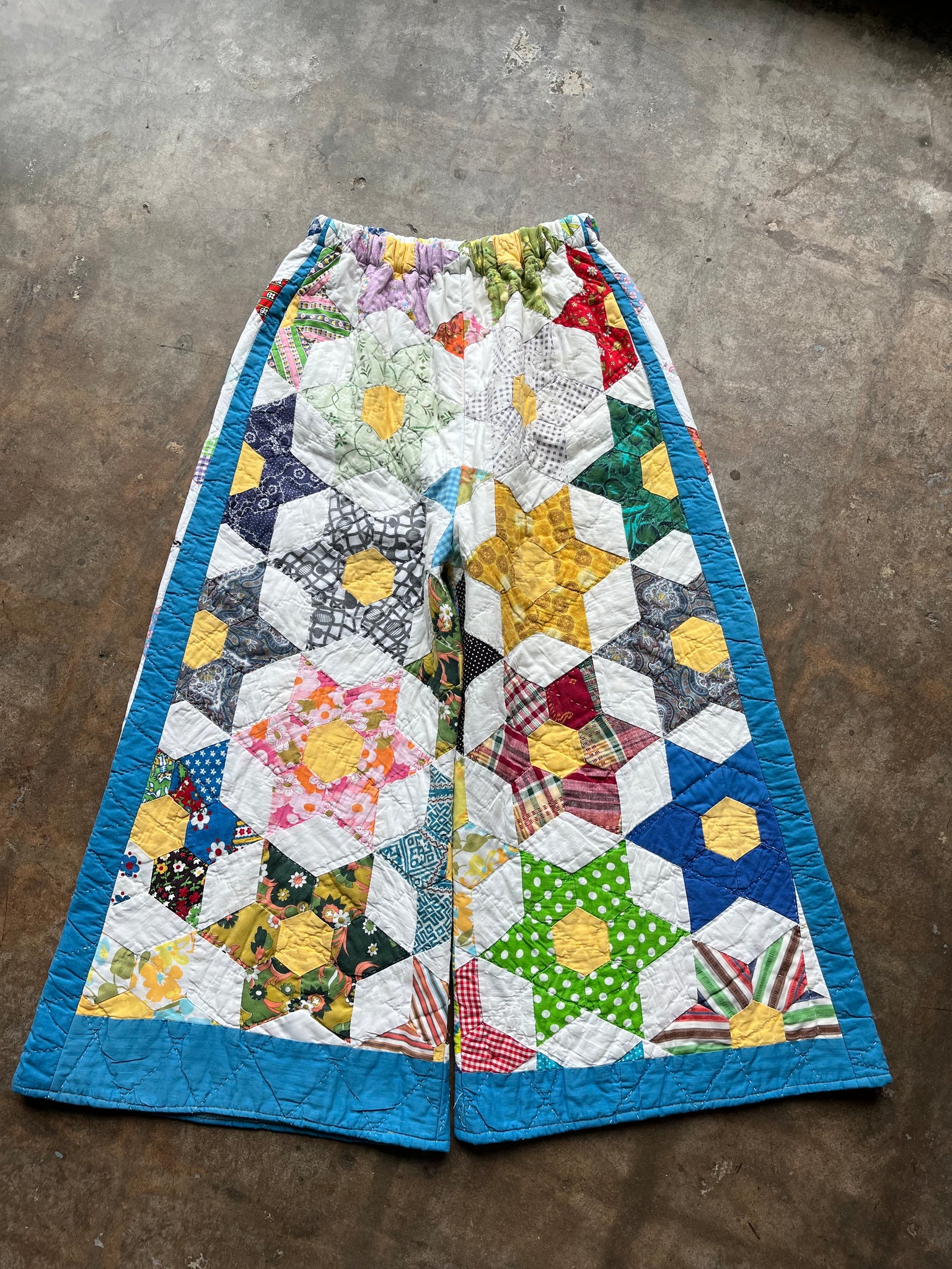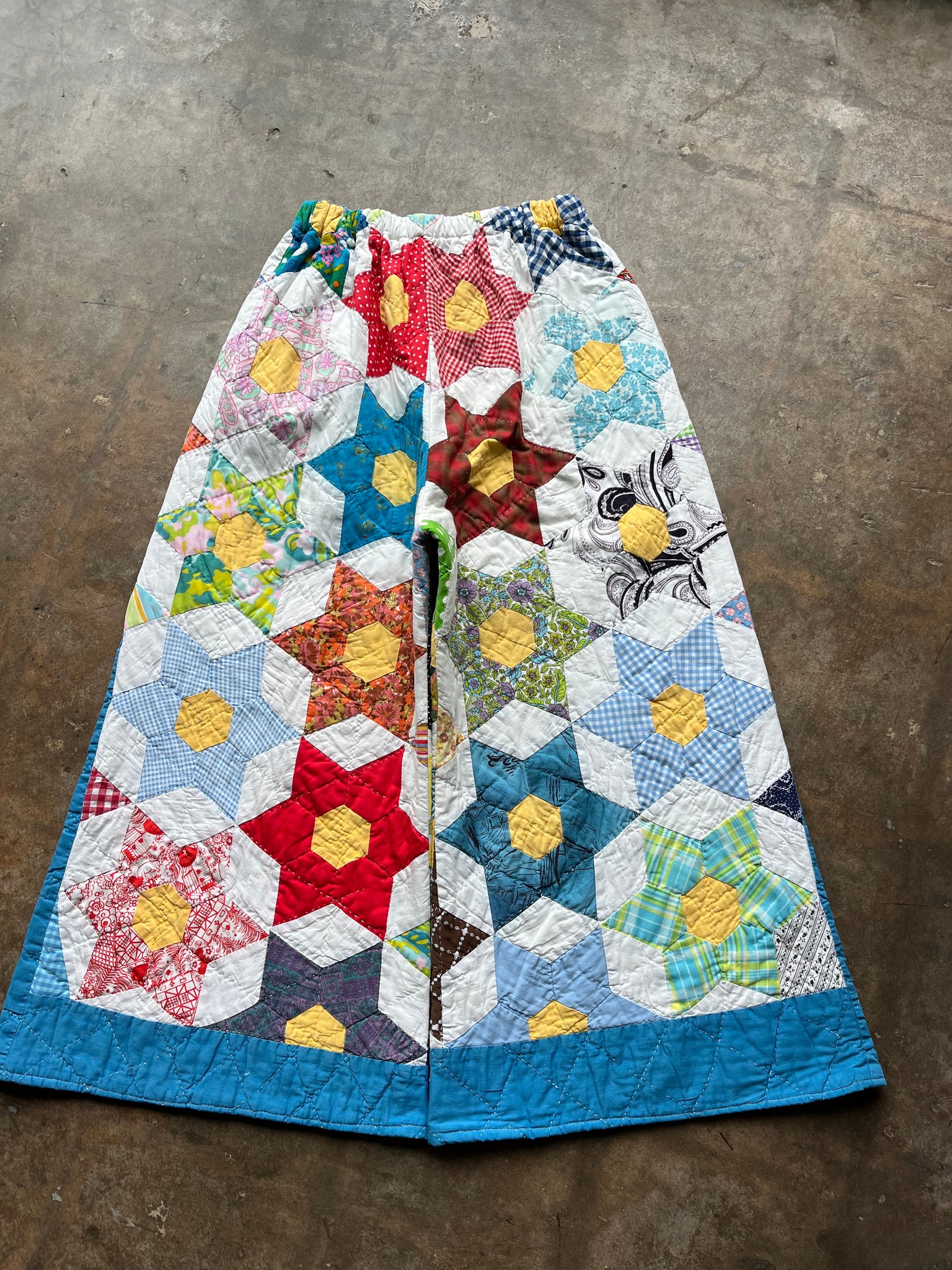 These pants are made from an Vintage 6 Point Star Quilt. There is a batting between the two layers, but I would say this a light weight quilt. Judging by the fabric, style, and that it is all hand stitched, I would say this is from the 1950s-1960s. This pant is made from a vintage palazzo pant pattern and features a wide leg, high waist, and elastic waist band to fit a variety of sizes. It also has inseam pockets for maximum comfort and utility :)