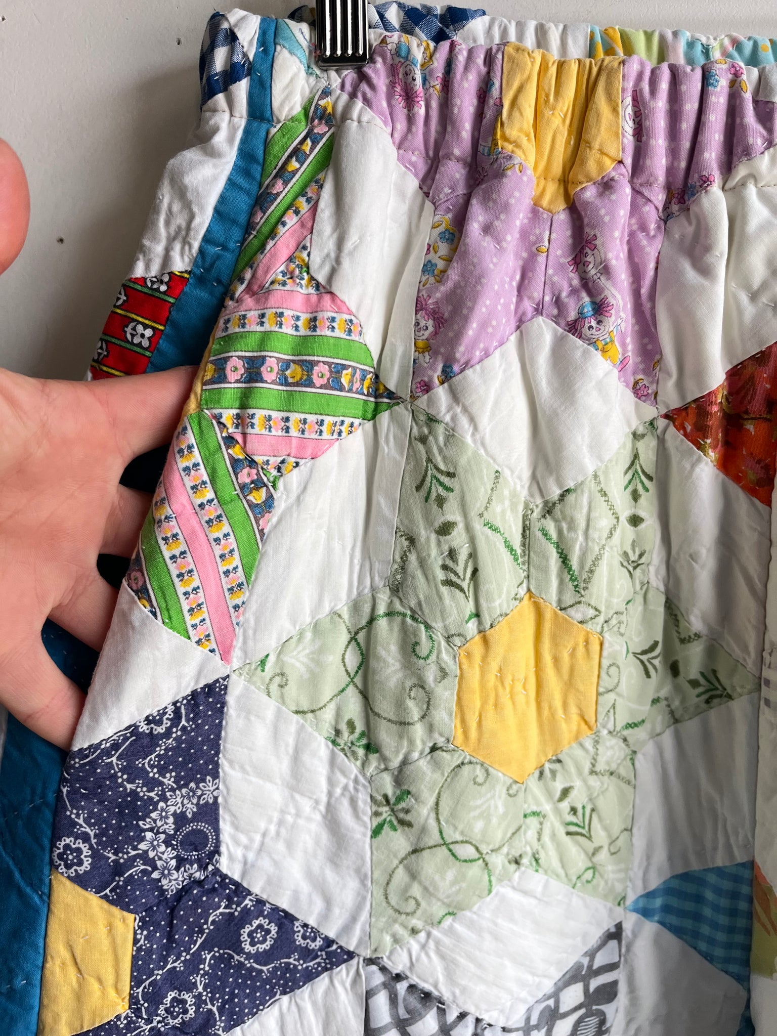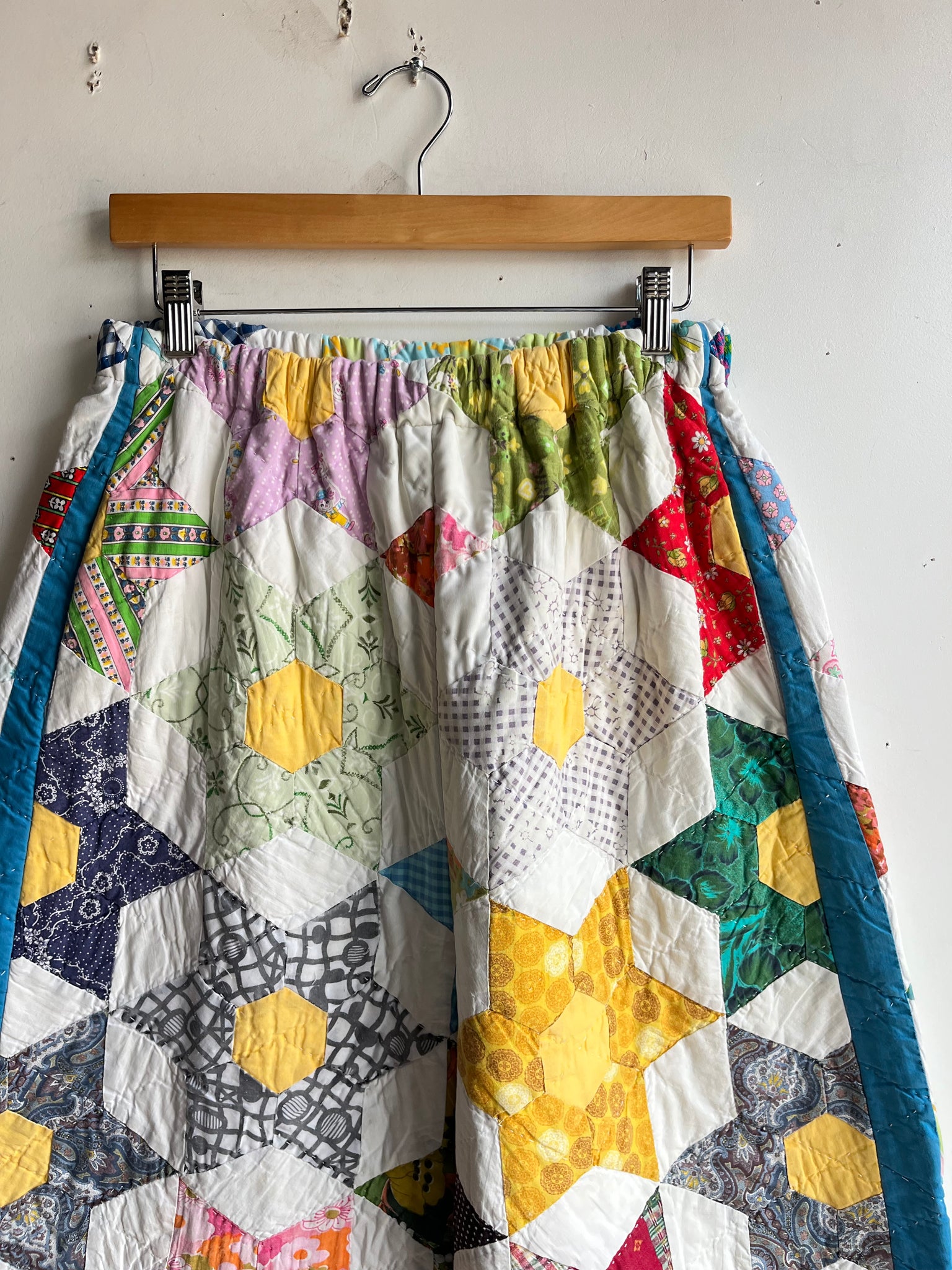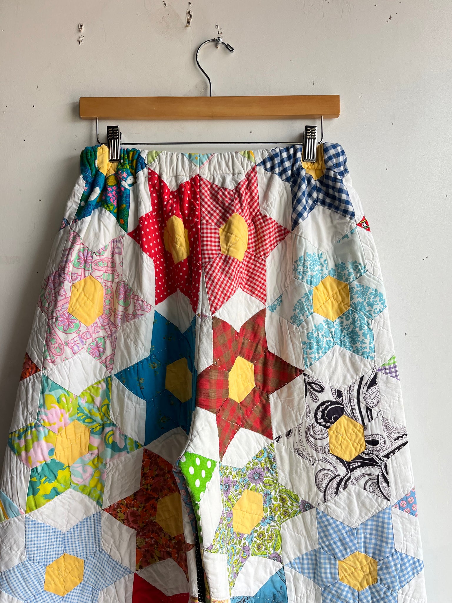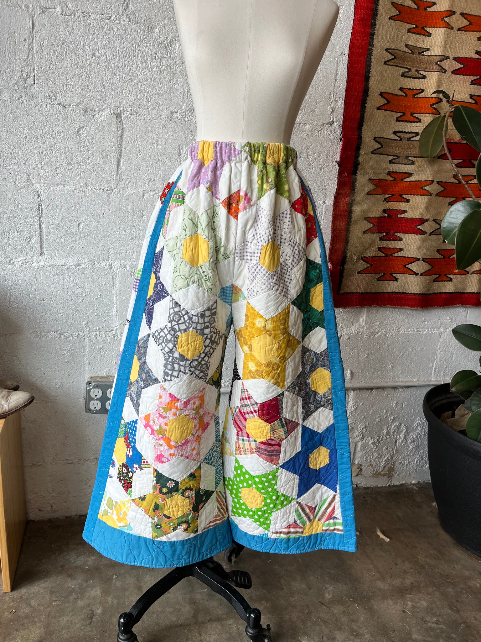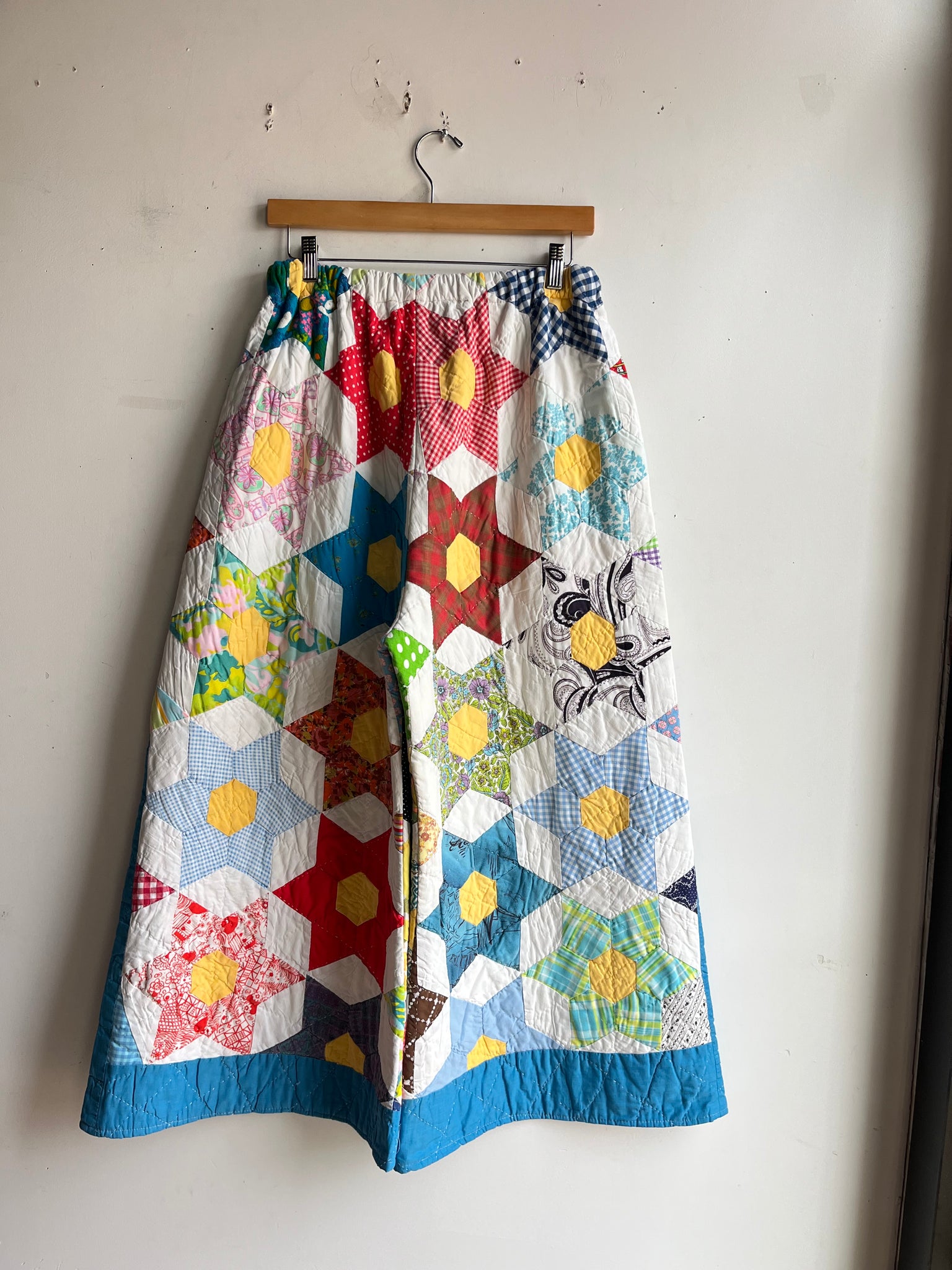 These pants are made from an Vintage 6 Point Star Quilt. There is a batting between the two layers, but I would say this a light weight quilt. Judging by the fabric, style, and that it is all hand stitched, I would say this is from the 1950s-1960s. This pant is made from a vintage palazzo pant pattern and features a wide leg, high waist, and elastic waist band to fit a variety of sizes. It also has inseam pockets for maximum comfort and utility :)
