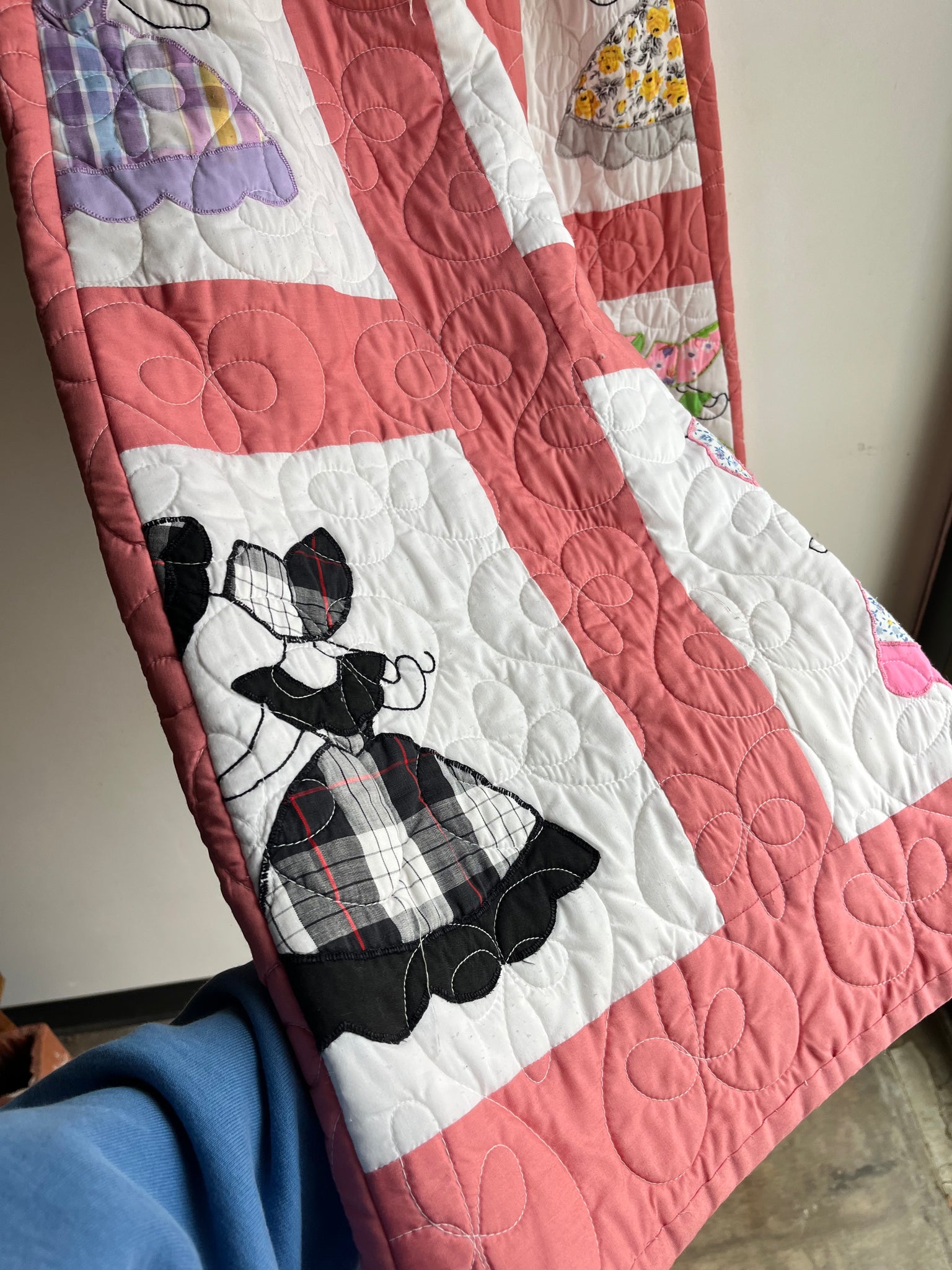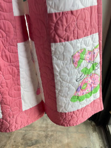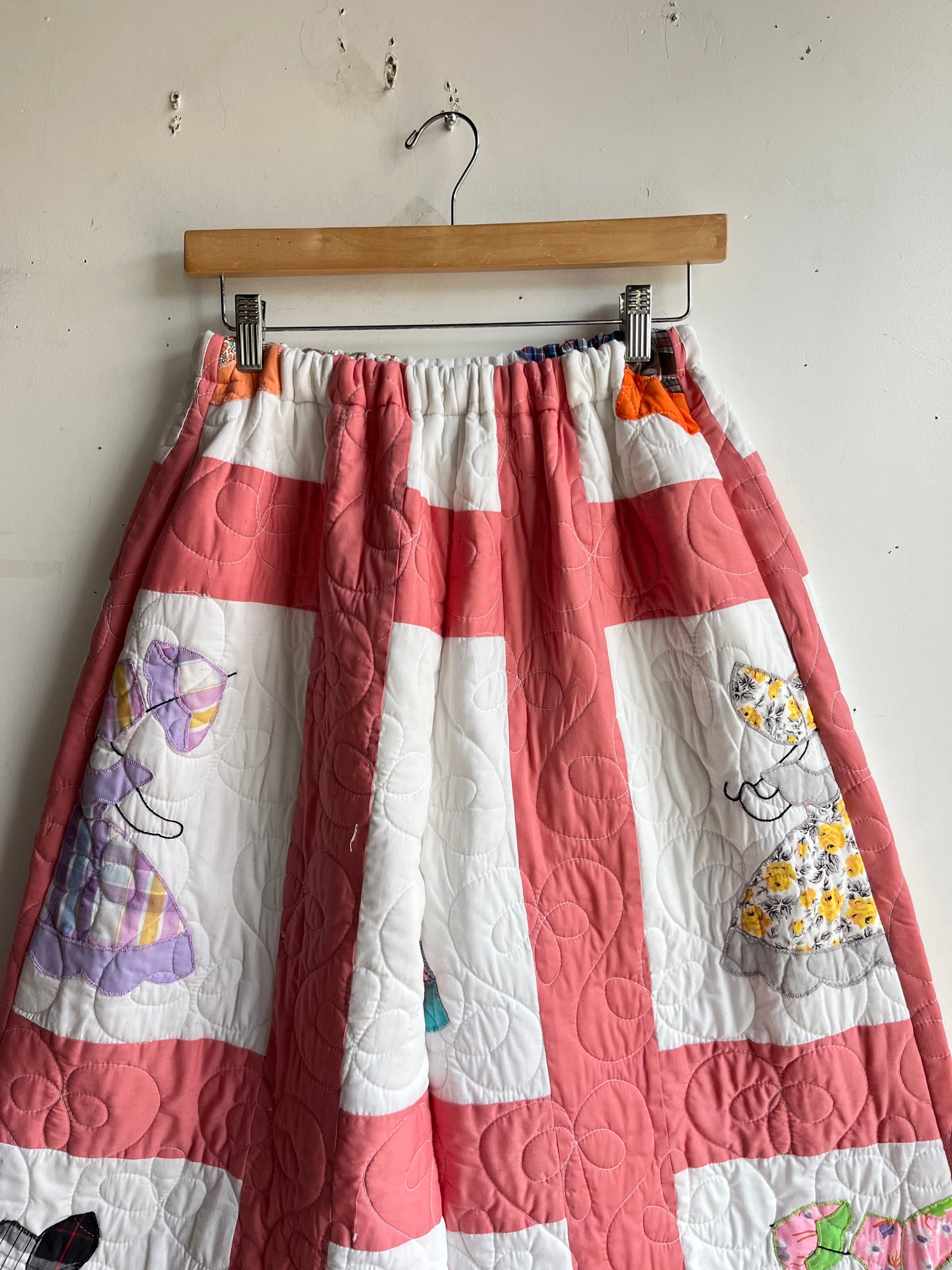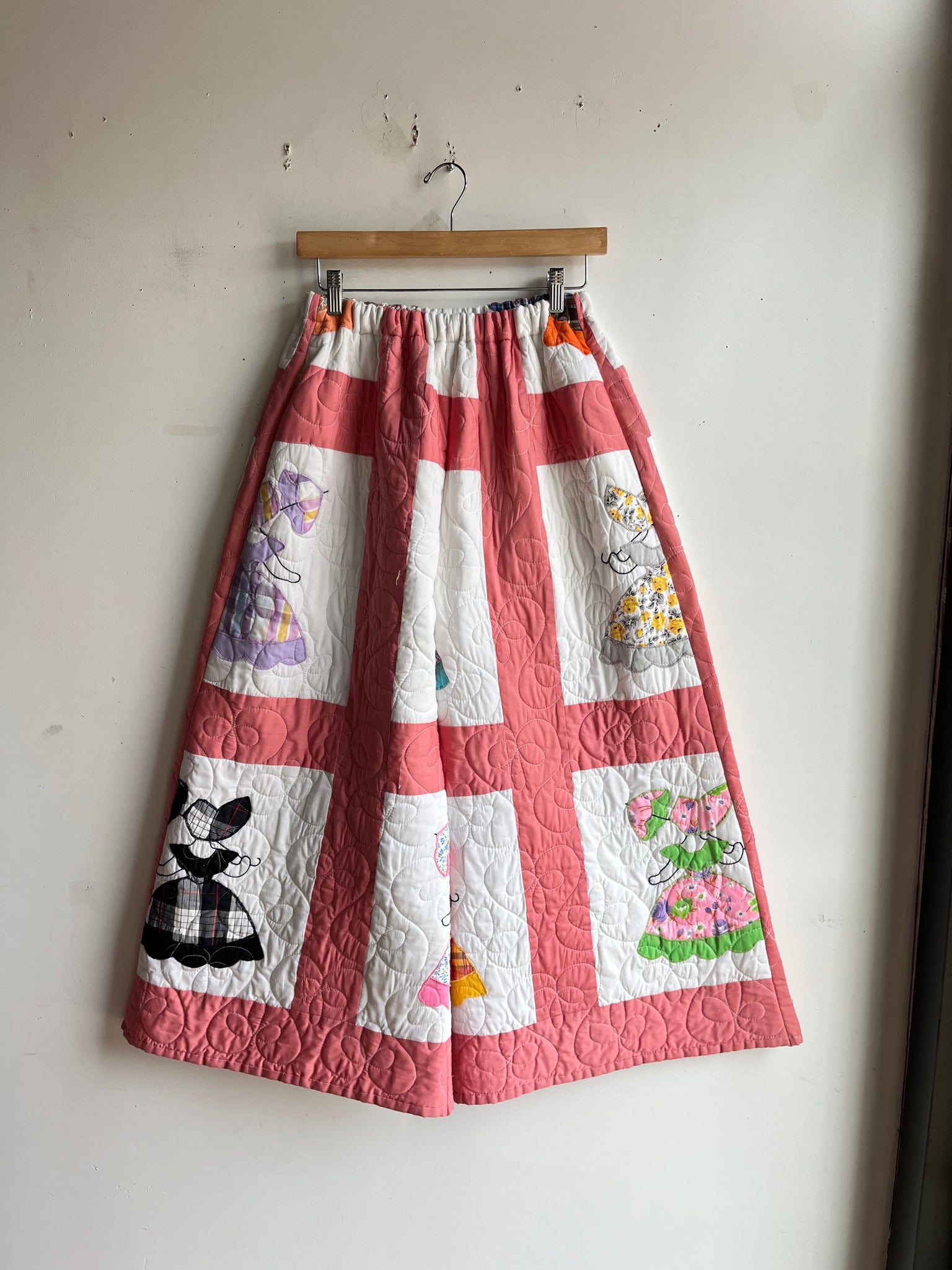 Color Scheme: White and pink with multi-colored and multi-patterned hand stitched parasol ladies appliques