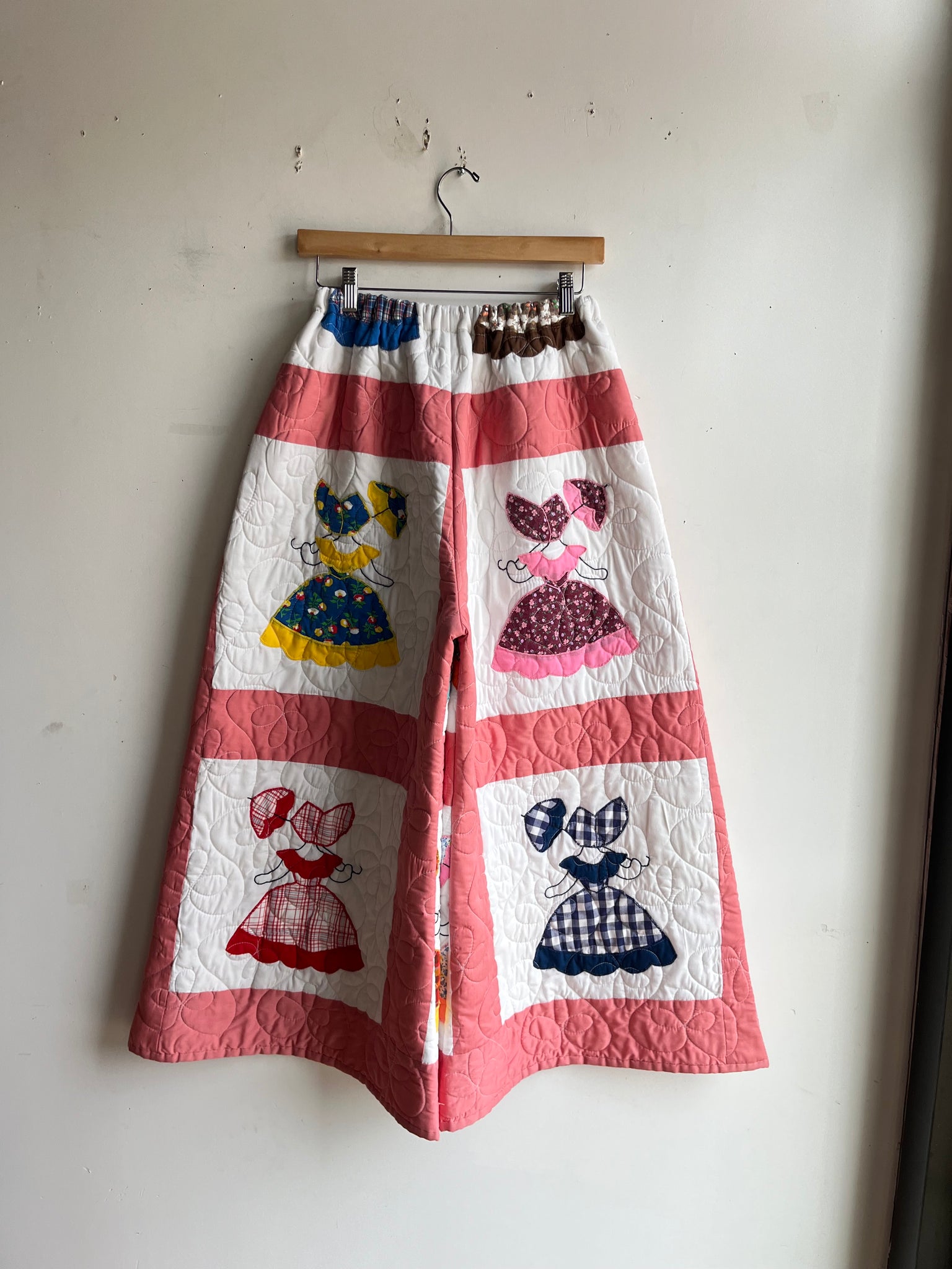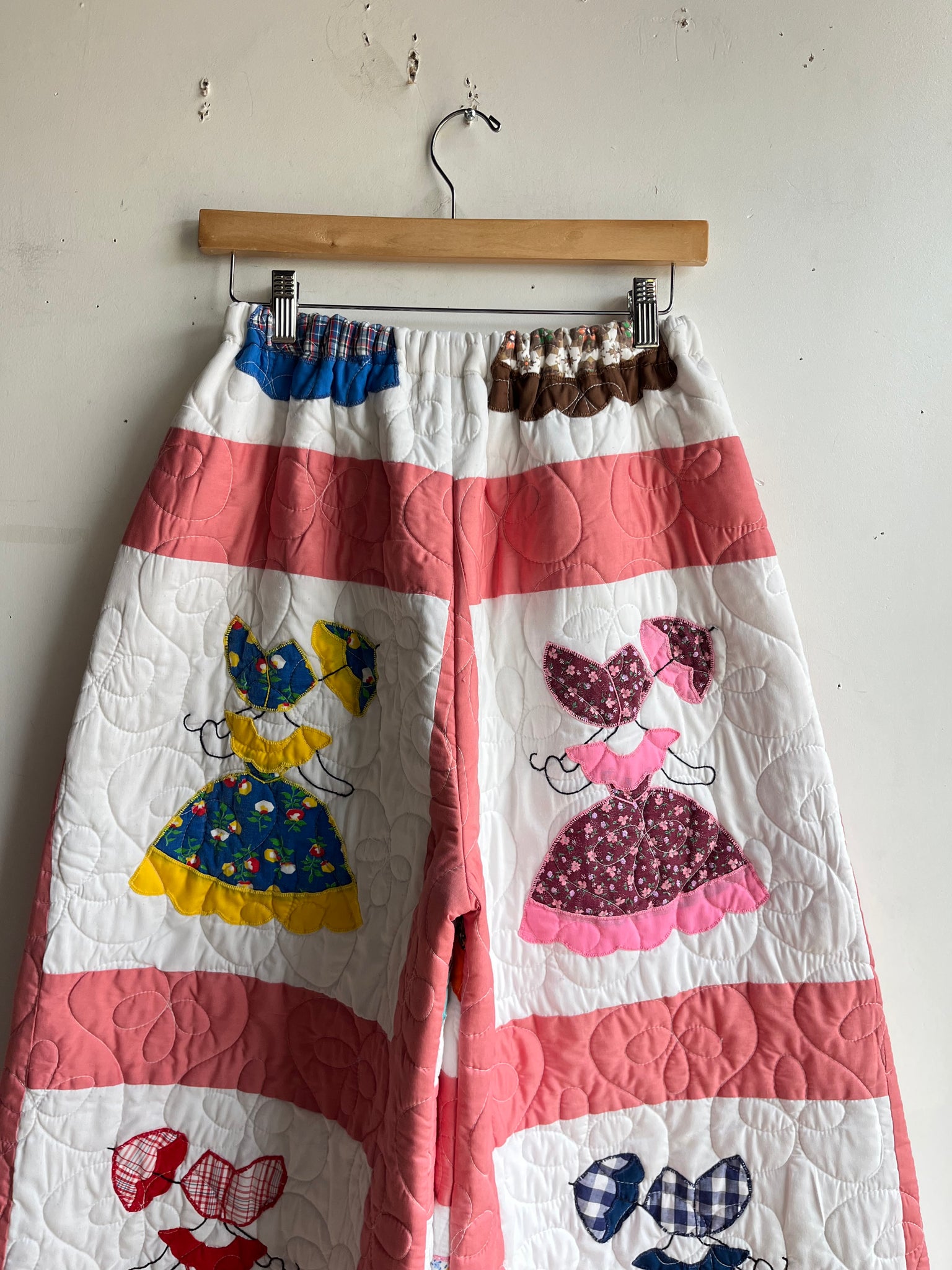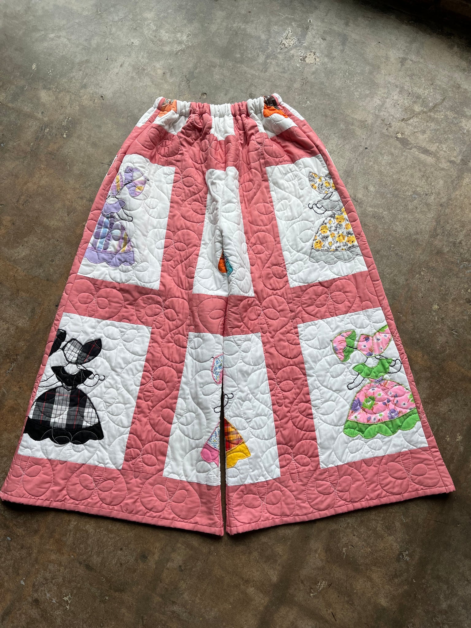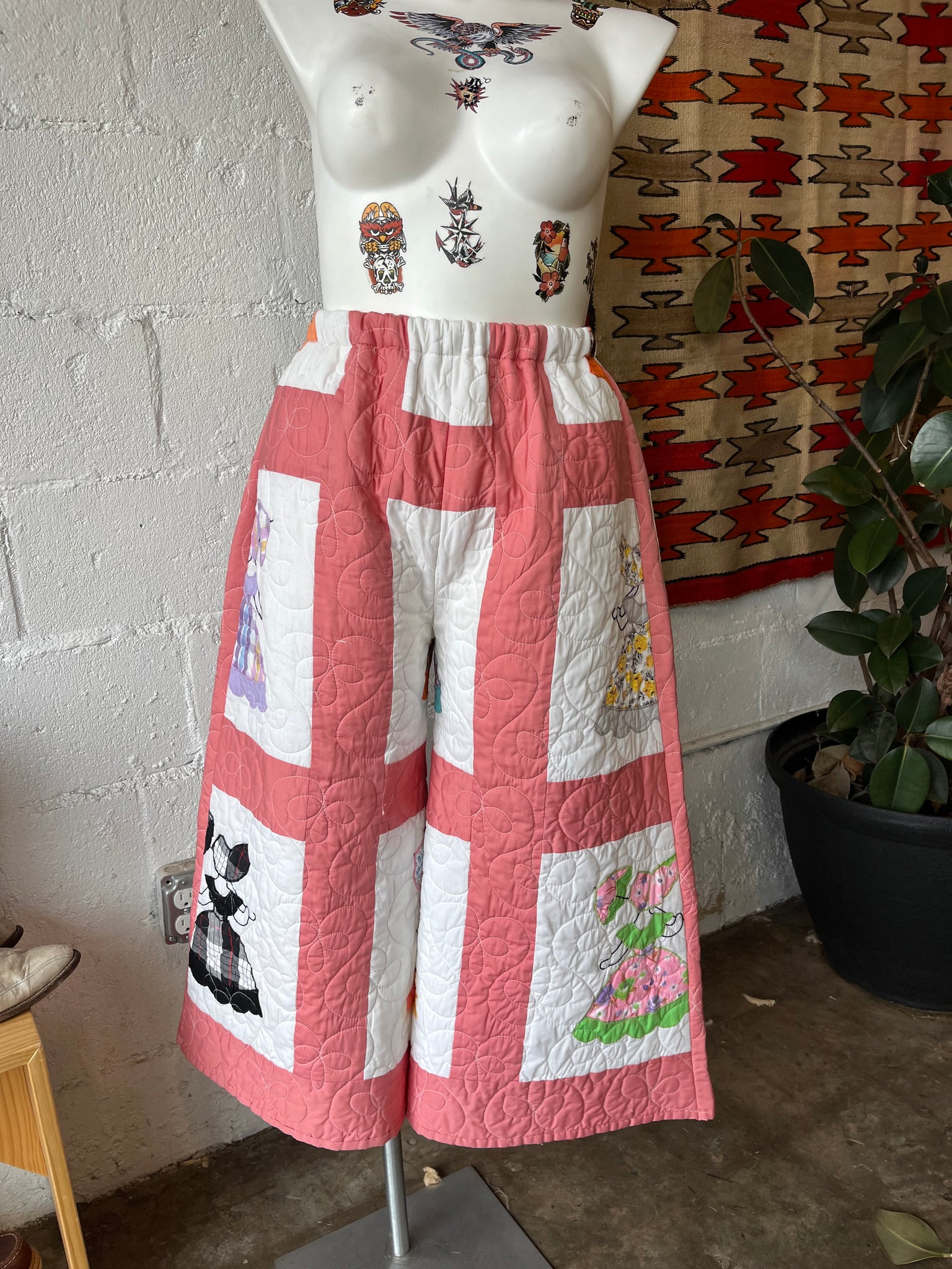 These pants are made from an Vintage Parasol Ladies Quilt. There is a batting between the two layers, but I would say this a light weight quilt. Judging by the fabric and style, I would say this is from the 1960s-1970s. This pant is made from a vintage palazzo pant pattern and features a wide leg, high waist, and elastic waist band to fit a variety of sizes. It also has inseam pockets for maximum comfort and utility :)