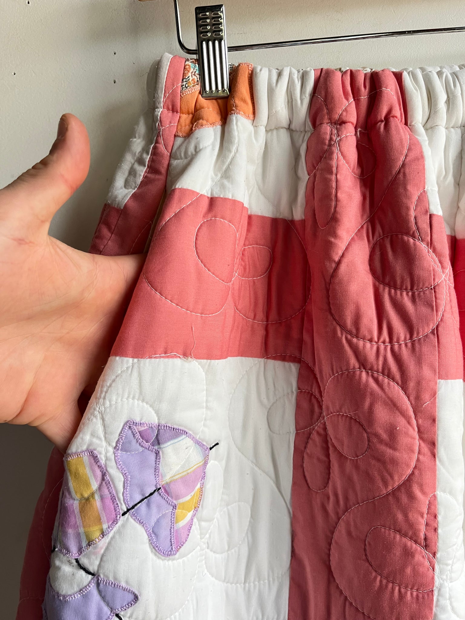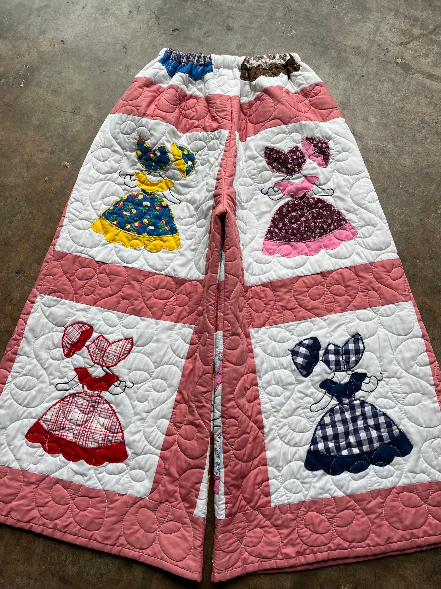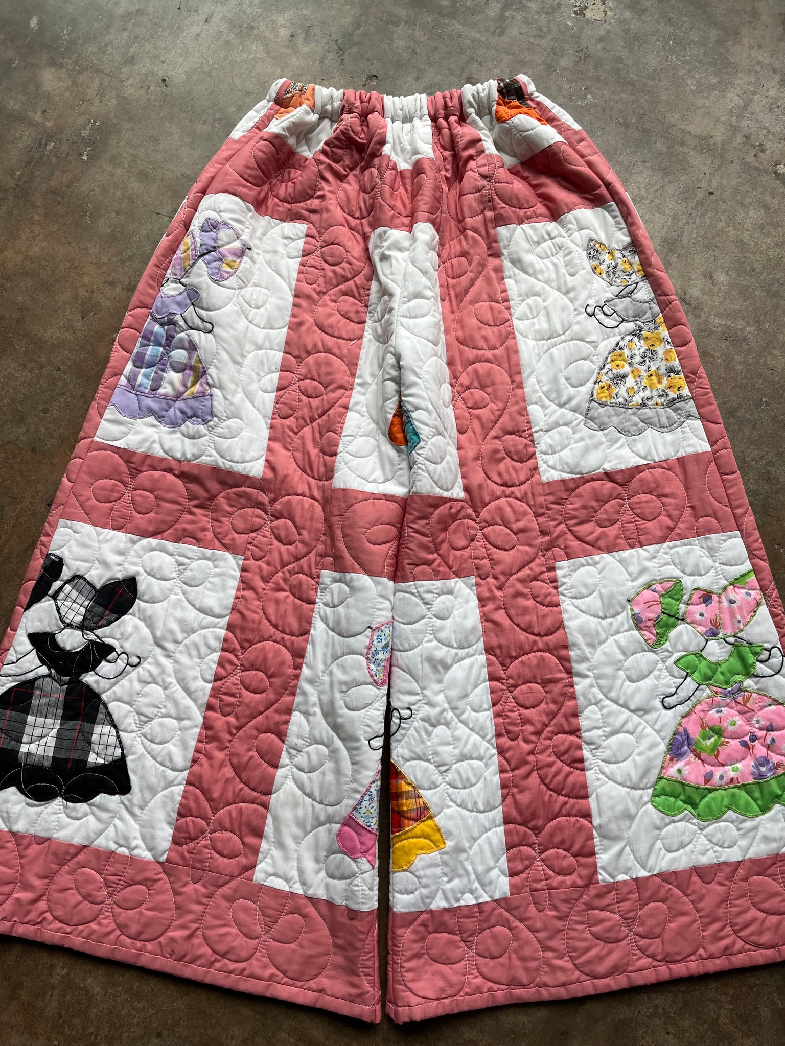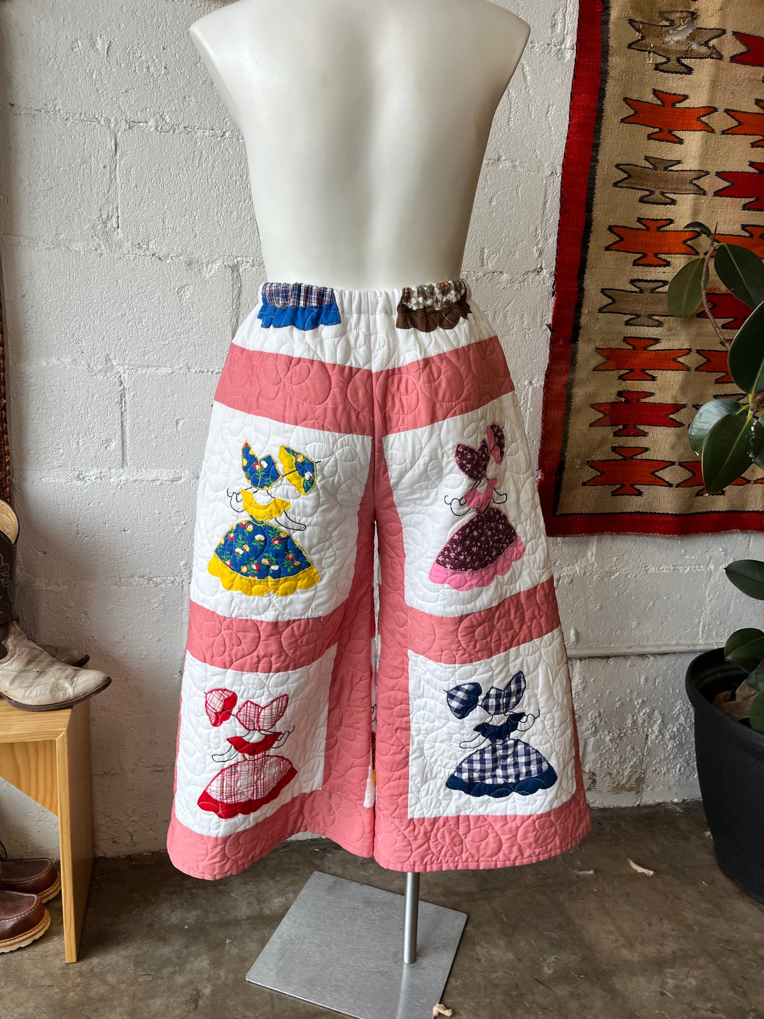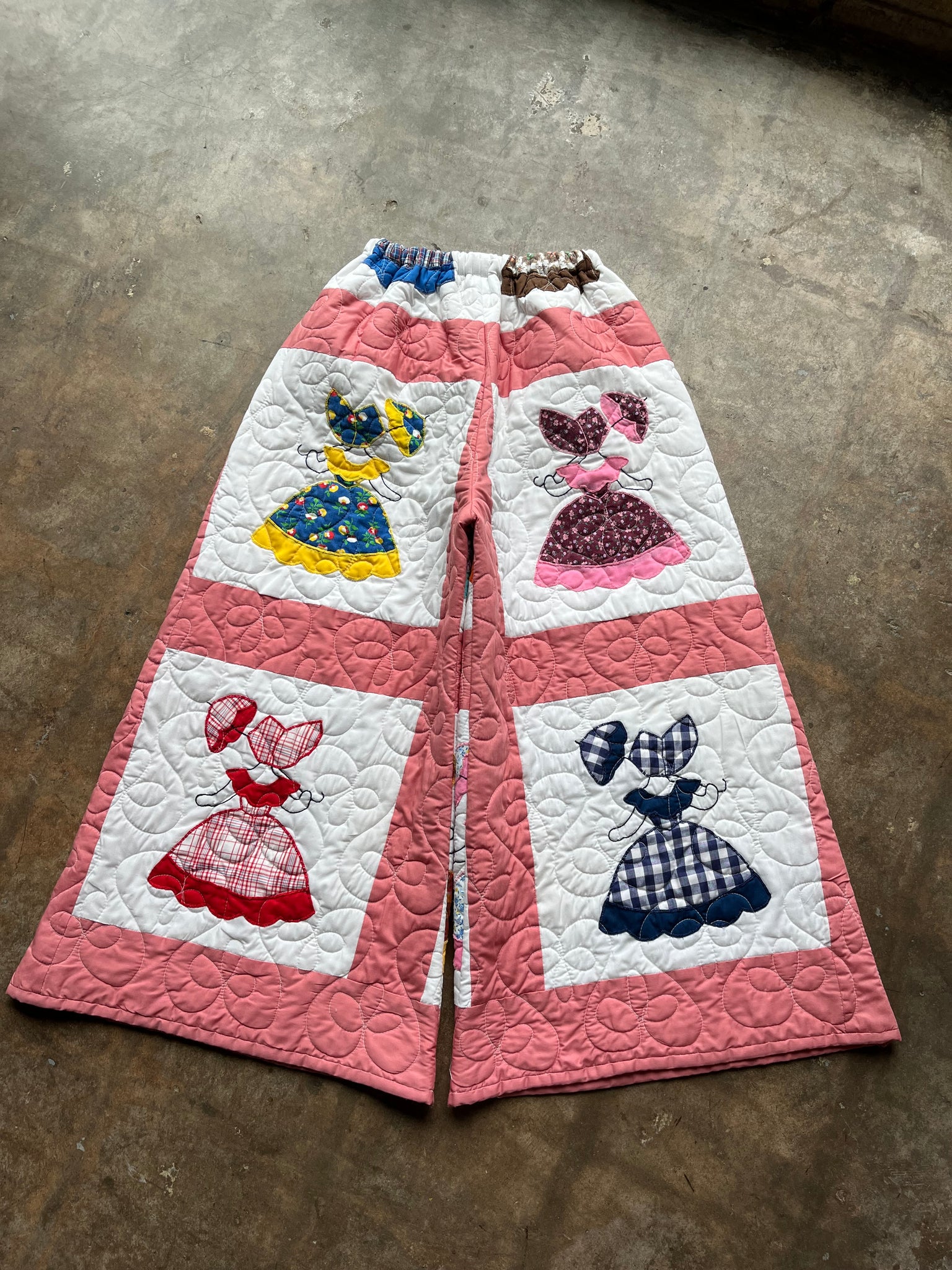 These pants are made from an Vintage Parasol Ladies Quilt. There is a batting between the two layers, but I would say this a light weight quilt. Judging by the fabric and style, I would say this is from the 1960s-1970s. This pant is made from a vintage palazzo pant pattern and features a wide leg, high waist, and elastic waist band to fit a variety of sizes. It also has inseam pockets for maximum comfort and utility :)