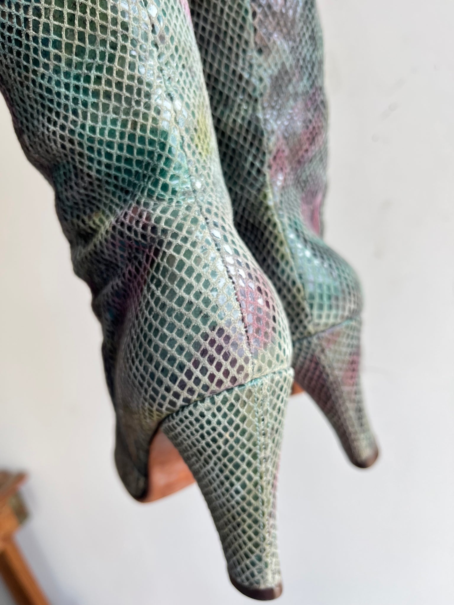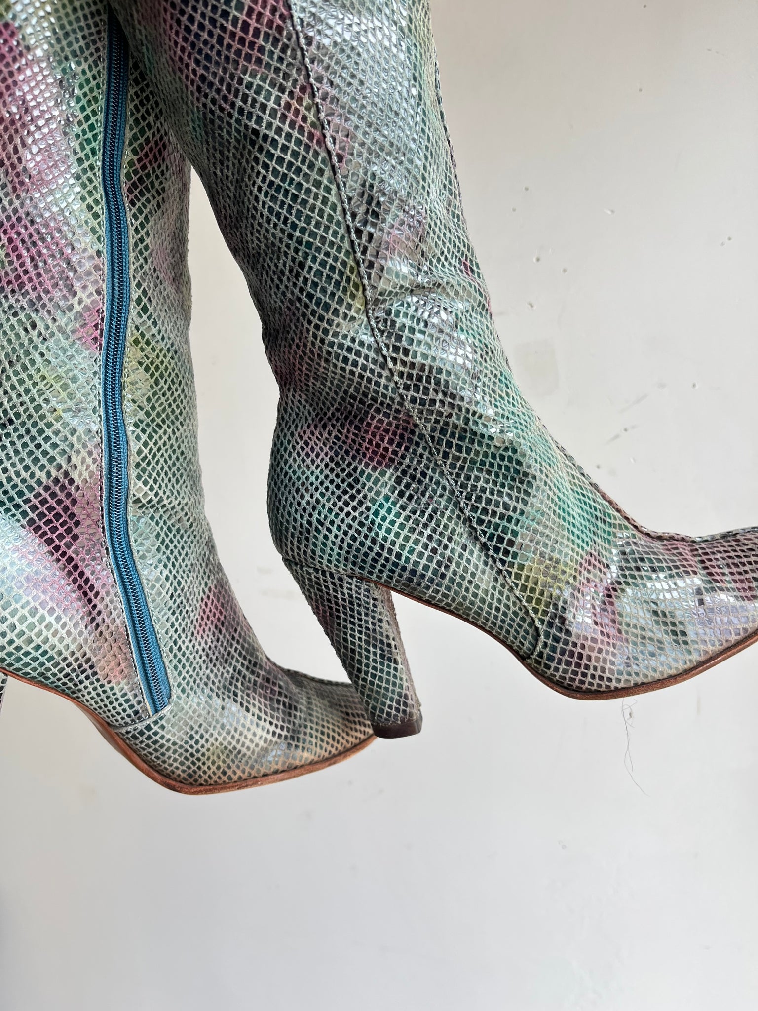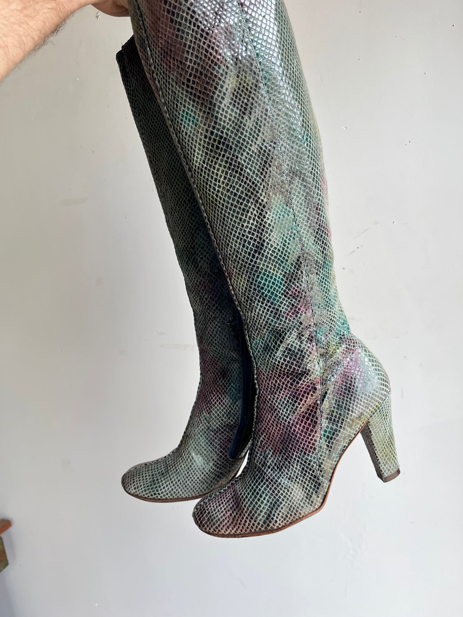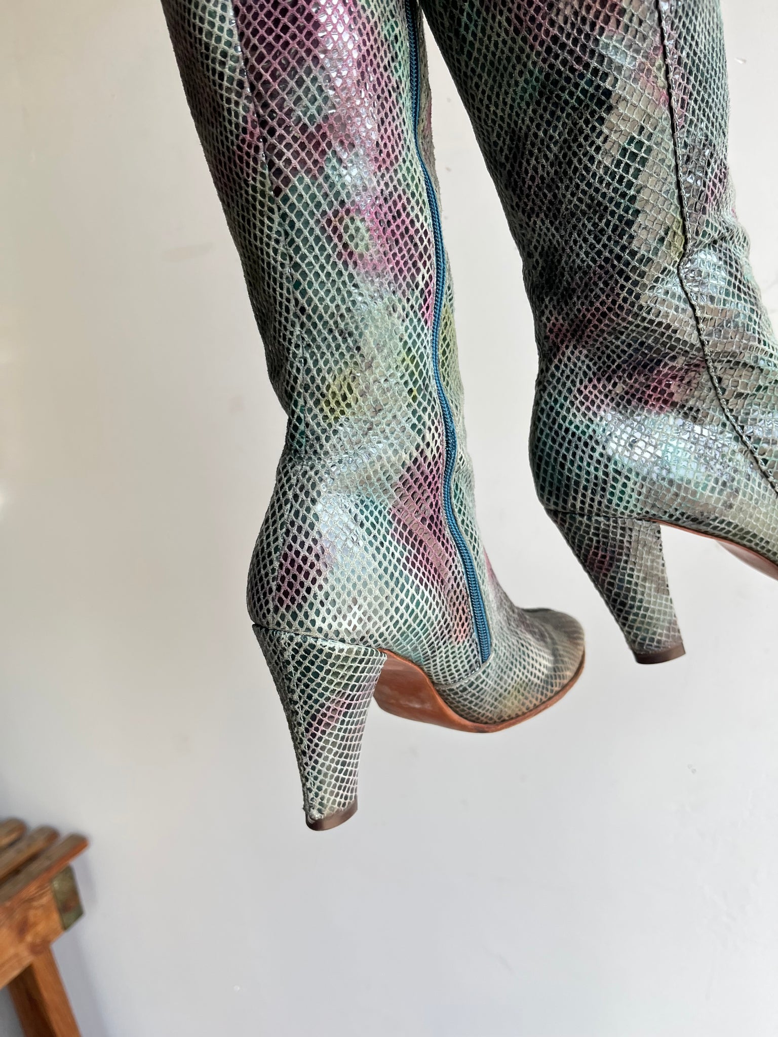 Rare 60s Shimmery Rainbow Snakeskin Knee High Boots